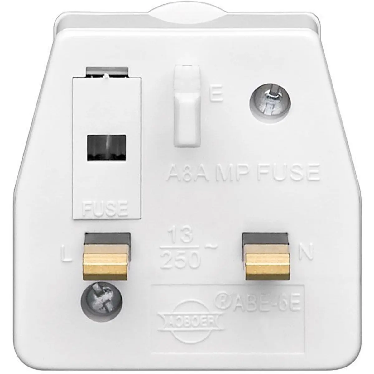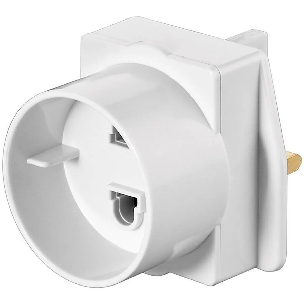 Adaptador de viagem com ficha inglesa (Tipo G) macho e ficha europeia (Tipo C) fêmea. Não converte a tensão; funciona apenas como adaptação de tomadas. Verifique se o seu dispositivo pode trabalhar com a tensão de linha antes de usar.
