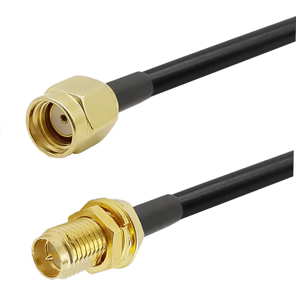 Cabo RP-SMA macho para RP-SMA fêmea com RG58 LowLoss de 2,0 m, utilizado em antenas para redes Wi-Fi/WLAN. Conectores RP-SMA reversos com fichas douradas proporcionam boa conectividade, baixa perda de sinal e fiabilidade em ligações RF. Ideal para instalações de antenas externas ou internas, com montagem simples em painéis ou suportes, assegurando desempenho estável em frequências de WLAN.