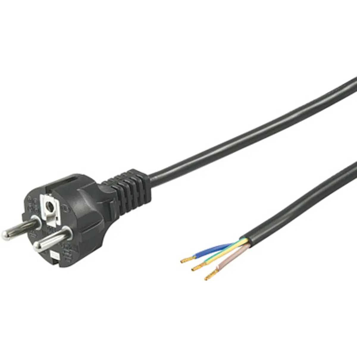 Cabo de alimentação em PVC com ficha Schuko para uso doméstico, apresentando 3 condutores de 0,75 mm², isolamento em PVC e comprimento de 1,5 metros. Compatível com redes de 250 VAC e uma capacidade de corrente de até 10/16 A. Ideal para ligar eletrodomésticos, ferramentas e dispositivos eletrónicos, oferecendo segurança, durabilidade e flexibilidade, com acabamento preto. Adequado a tomadas europeias e ambientes interiores.