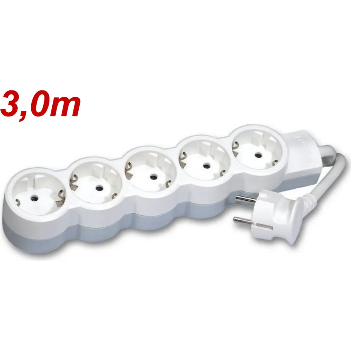 Bloco de 5 tomadas Legrand com uma tomada a 90º para ligar um transformador, sem que uma outra tomada seja obstruída.