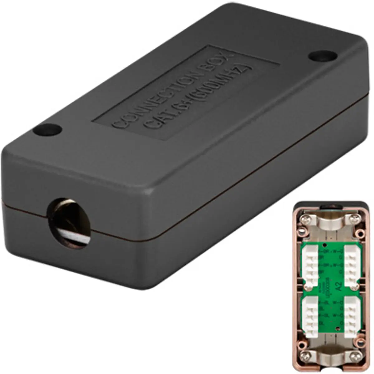 Caixa de ligação para cabos RJ45 Cat6 com conectores LSA de impacto, versão STP blindada e caixa plástica metalizada. Ideal para unir cabos Cat6 em redes Ethernet, proporcionando proteção contra interferências e uma construção robusta. A solução facilita a organização de infraestruturas de rede, mantendo os cabos protegidos, com conectores confiáveis e montagem simples em instalações interiores.