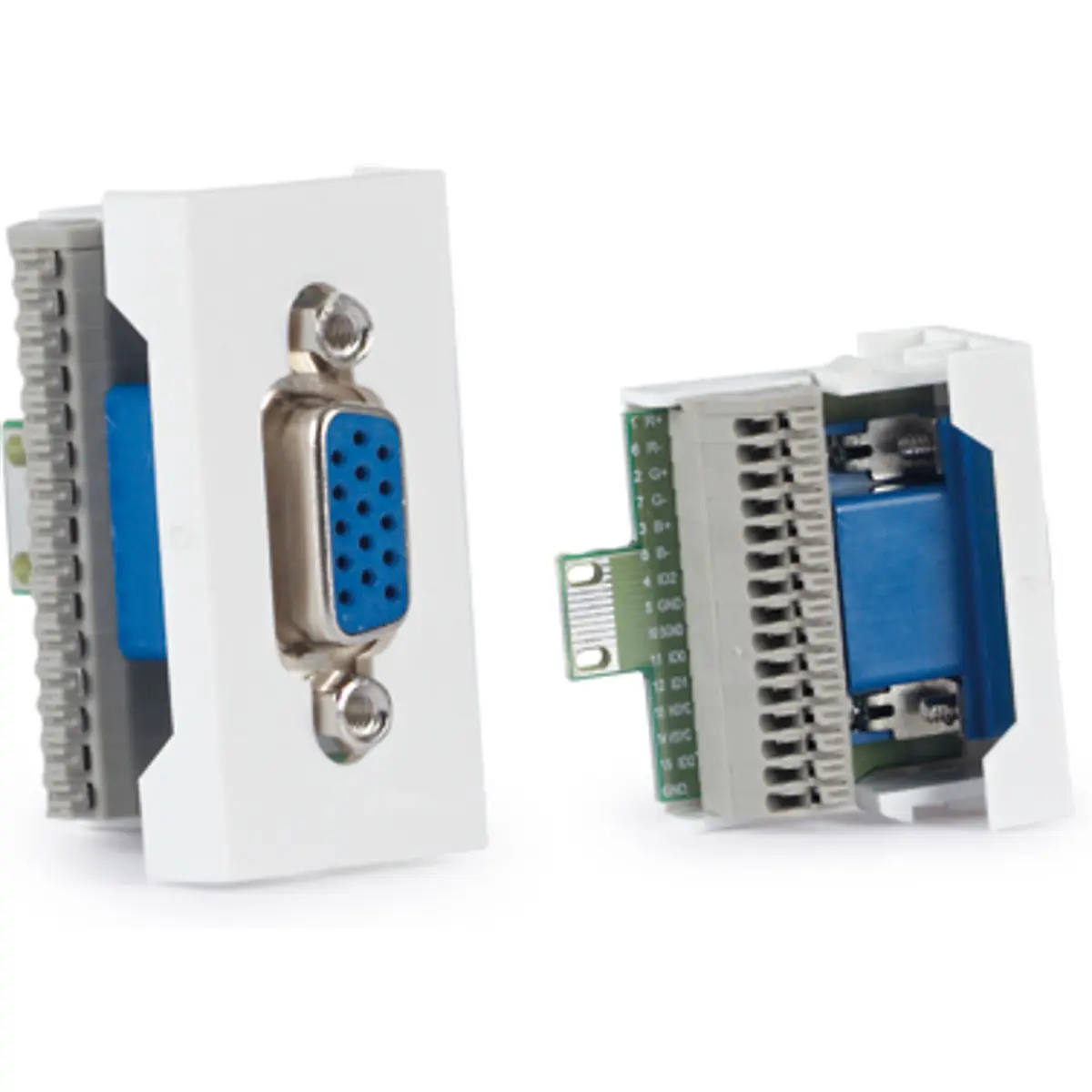 Conector VGA HD15 fêmea para 1/2 painel de ligação, indicado para painéis de ligação modulares. Oferece ligação rápida sem parafusos, ideal para montagem eficiente em sistemas que exigem conectividade VGA estável. Dimensões compactas de 22,5 x 45 x 42,6 mm facilitam a integração em painéis modulares sem ocupar espaço excessivo.