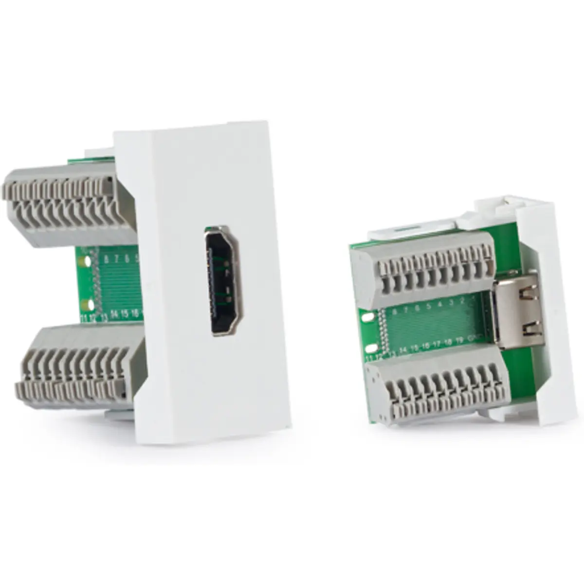 Conector HDMI fêmea para painéis de ligação modulares, com ligação rápida sem parafusos, ideal para montagem em painéis modulares. Dimensões: 22,5 x 45 x 39,2 mm. Compatível com cabos HDMI padrão, facilita substituição e manutenção, reduz o tempo de instalação e elimina ferramentas adicionais. Ideal para soluções modulares que exigem conectividade HDMI fiável e rápida, sem comprometer o arranjo do painel.