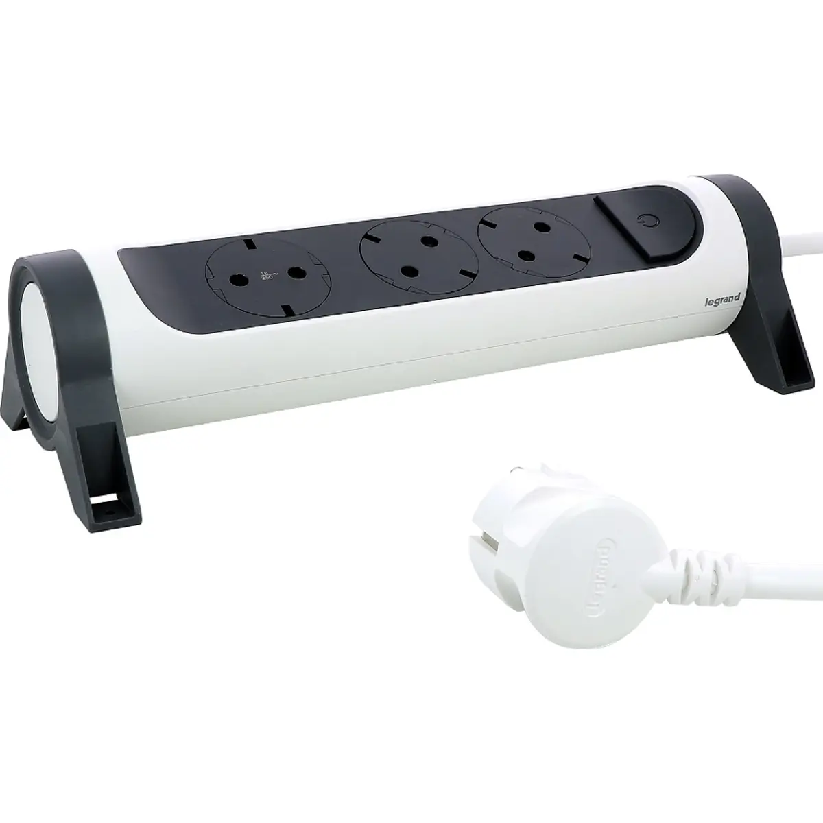 ● tomadas à face com alvéolos inclinados a 45° (exceto uma com um ângulo de 90° para permitir ligar um transformador de maiores dimensões sem bloquear as outras tomadas);