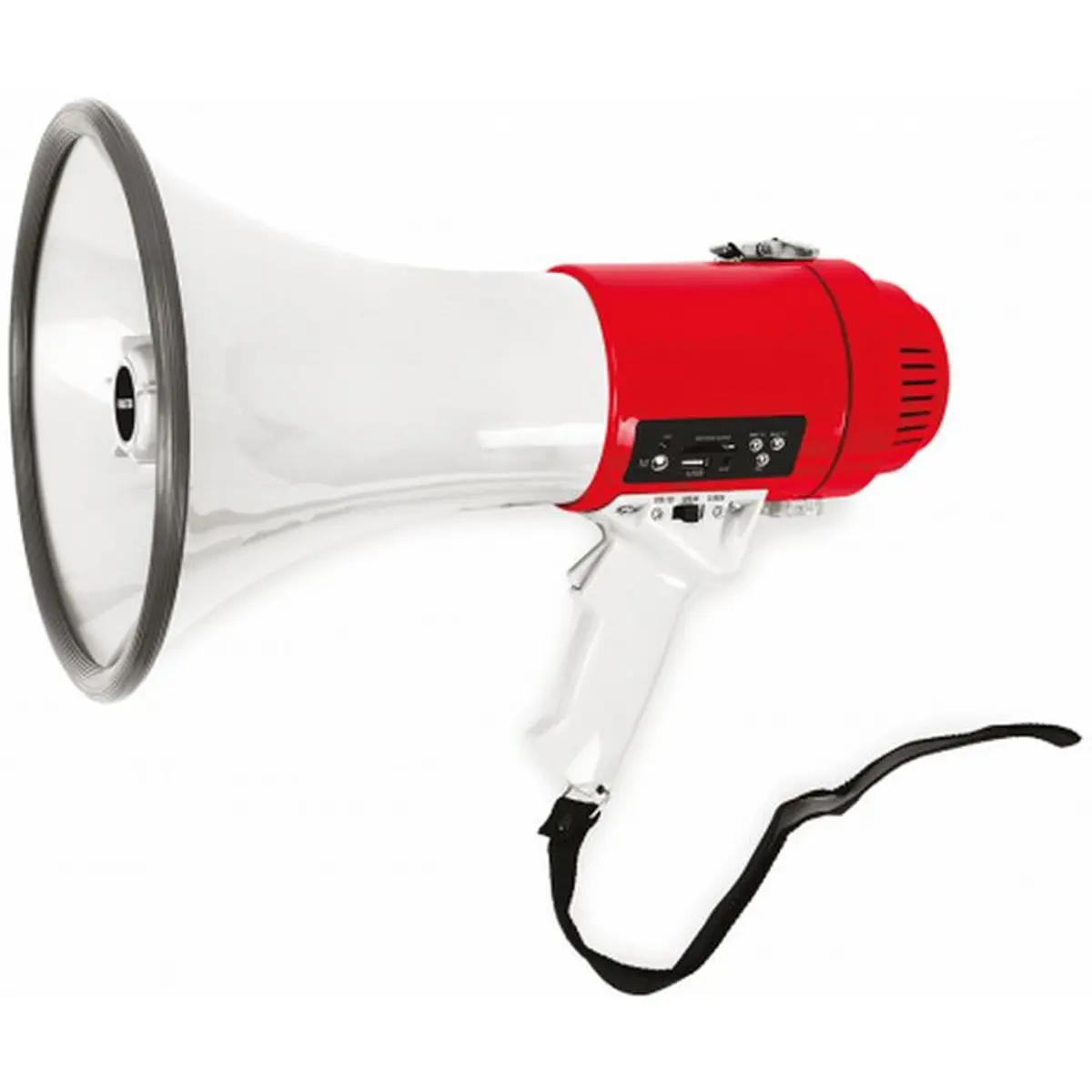 Megafone de 25W com sirene e leitor USB/SD/MP3, ideal para comunicações eventuais. Pode funcionar com 8 pilhas LR14-C ou através de alimentação de 12VDC (conector 5,5x2,1mm). Possui dimensões de 37x23 cm, facilitando o manuseamento e montagem.