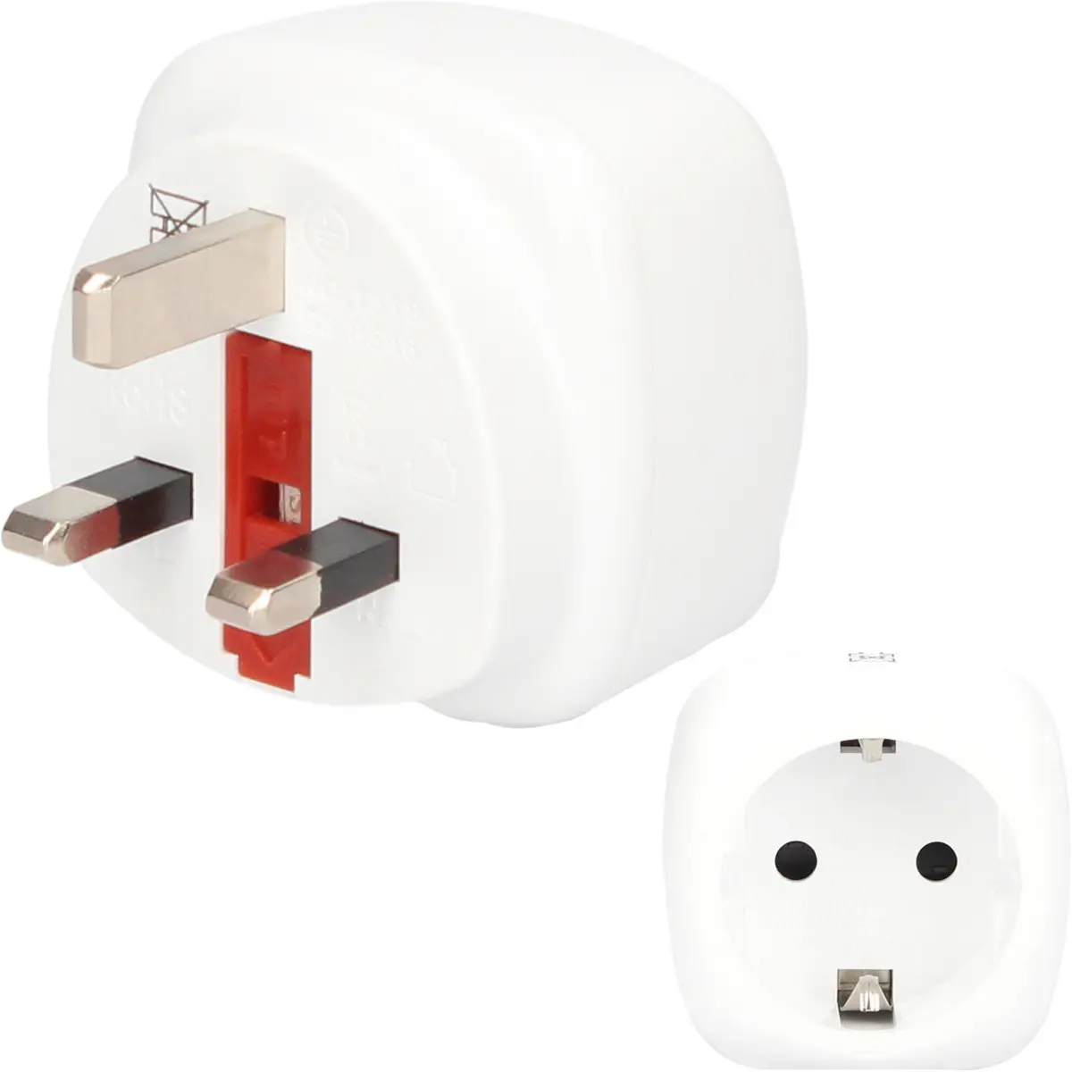Adaptador de viagem entre tomadas britânicas (Tipo G) e europeias (Tipo F). Permite ligar aparelhos com ficha europeia a tomadas do Reino Unido sem converter a voltagem. Entrada: Euro schuko fêmea (Tipo F, CEE 7/4); saída: ficha inglesa (Tipo G, BS 1363). Preto, compacto e fácil de transportar, ideal para viagens, hotéis e uso diário entre redes com tensões diferentes, assegurando conectividade rápida e segura.