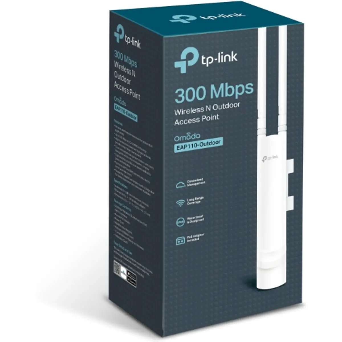 Ponto de acesso exterior wireless N 300Mbps na banda de 2,4 GHz com suporte a 802.11n/g/b. Gestão centralizada via Omada Controller gratuito e compatibilidade com EAP110-Outdoor (V3+). Construção durável para exteriores, montagem em poste ou parede, PoE Passivo (24V) e consumo de 3,12 W. Antenas externas de 2x3dBi, múltiplos SSIDs (até 8), portal cativo para autenticação de convidados e suporte a VLAN para redes segmentadas.