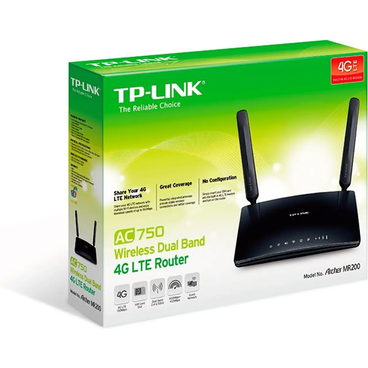 Router 4G TP-Link Archer MR200, Wireless Dual Band 802.11ac 750Mbps (AC750), suporta cartões SIM 3G/4G e Ethernet WAN. Velocidades 4G/LTE até 150Mbps. LAN 10/100 x4. 2 Antenas 4G externas para melhor captação de sinal