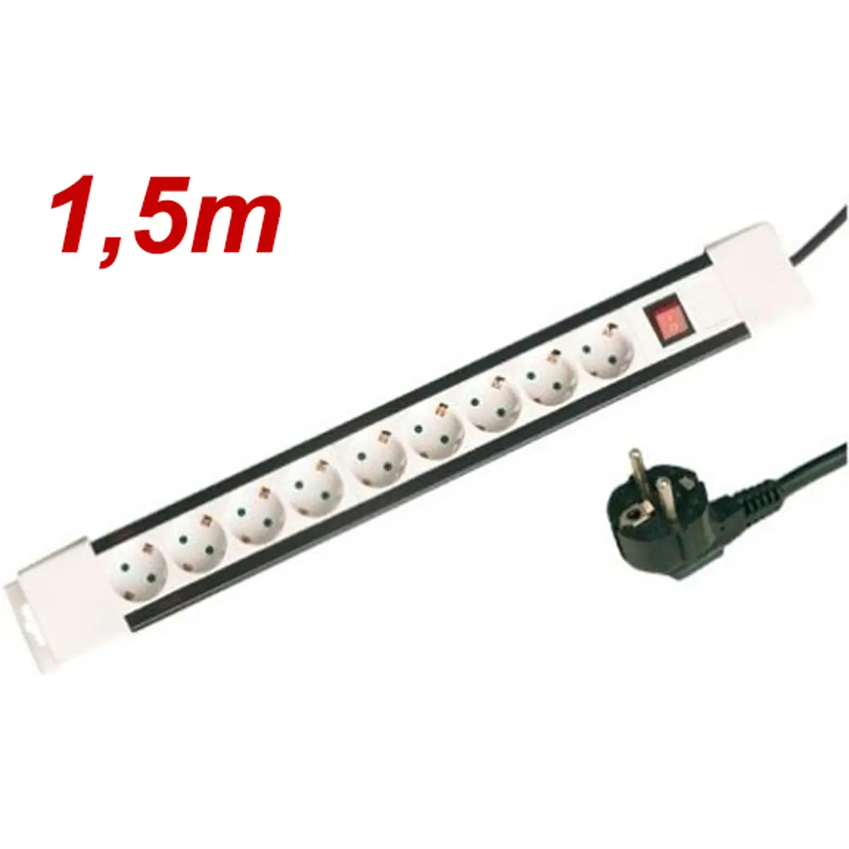 Bloco de tomadas com 9 tomadas Schuko e interruptor, indicado para uso interior. Possui cabo de 1,5 m em H05VV-F, seção 3x1,5mm² e potência máxima de 3500W, oferecendo gestão de energia centralizada, organização de cabos e alimentação de vários dispositivos elétricos em casa ou no escritório.