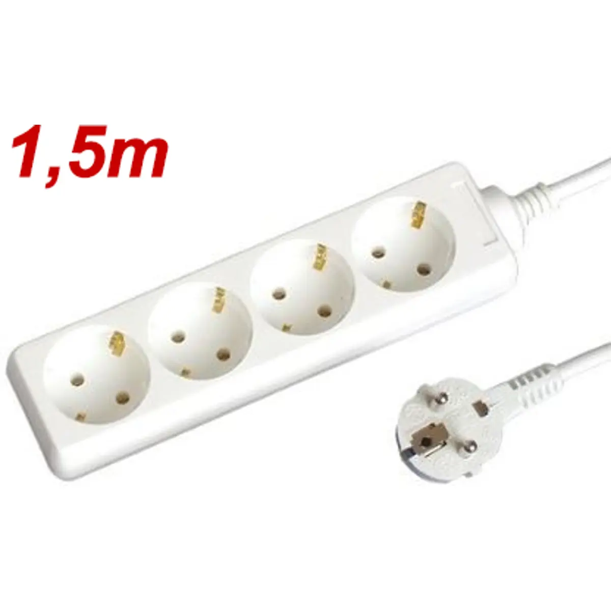 Bloco de tomadas com quatro saídas Schuko para uso interior, com cabo de 1,5 m em H05VV-F e secção 3x1,5mm, de cor branca. Sem interruptor, fornece potência máxima de 3500 W, ideal para organizar dispositivos eletrónicos numa secretária, sala ou escritório. Facilita a ligação de múltiplos aparelhos num único cubo de tomadas, mantendo organização e acessibilidade. Compatível com redes domésticas, oferece segurança básica e um design compacto para otimizar o espaço e facilitar a gestão de energia.
