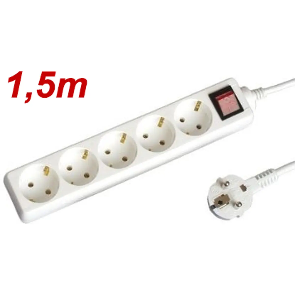 Bloco de tomadas com 5 fichas Schuko e interruptor, adequado para uso interior. Corpo branco, cabo elétrico H05VV-F, secção 3x1.5mm e comprimento de 1,5 m, oferece potência máxima de 3500 W. Ideal para organizar dispositivos num único suporte, incluindo eletrodomésticos e ferramentas, em casa ou escritório, proporcionando acesso rápido à energia e controlo através do interruptor.