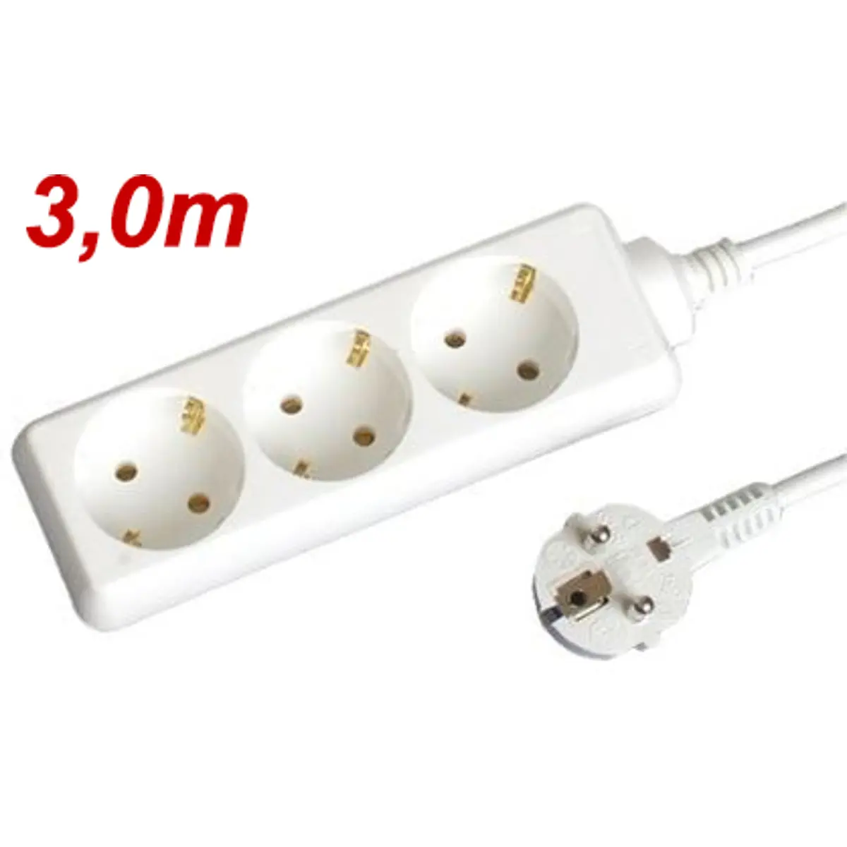 Bloco de tomadas para interior com base múltipla e 3 tomadas Schuko, sem interruptor. Cabo de alimentação H05VV-F, secção 3x1.5mm² e comprimento de 3.0m, potência máxima de 3500W. Ideal para ligar vários dispositivos em casa ou no escritório, mantendo a organização de cabos e a fiabilidade elétrica, sem necessidade de interruptores adicionais.