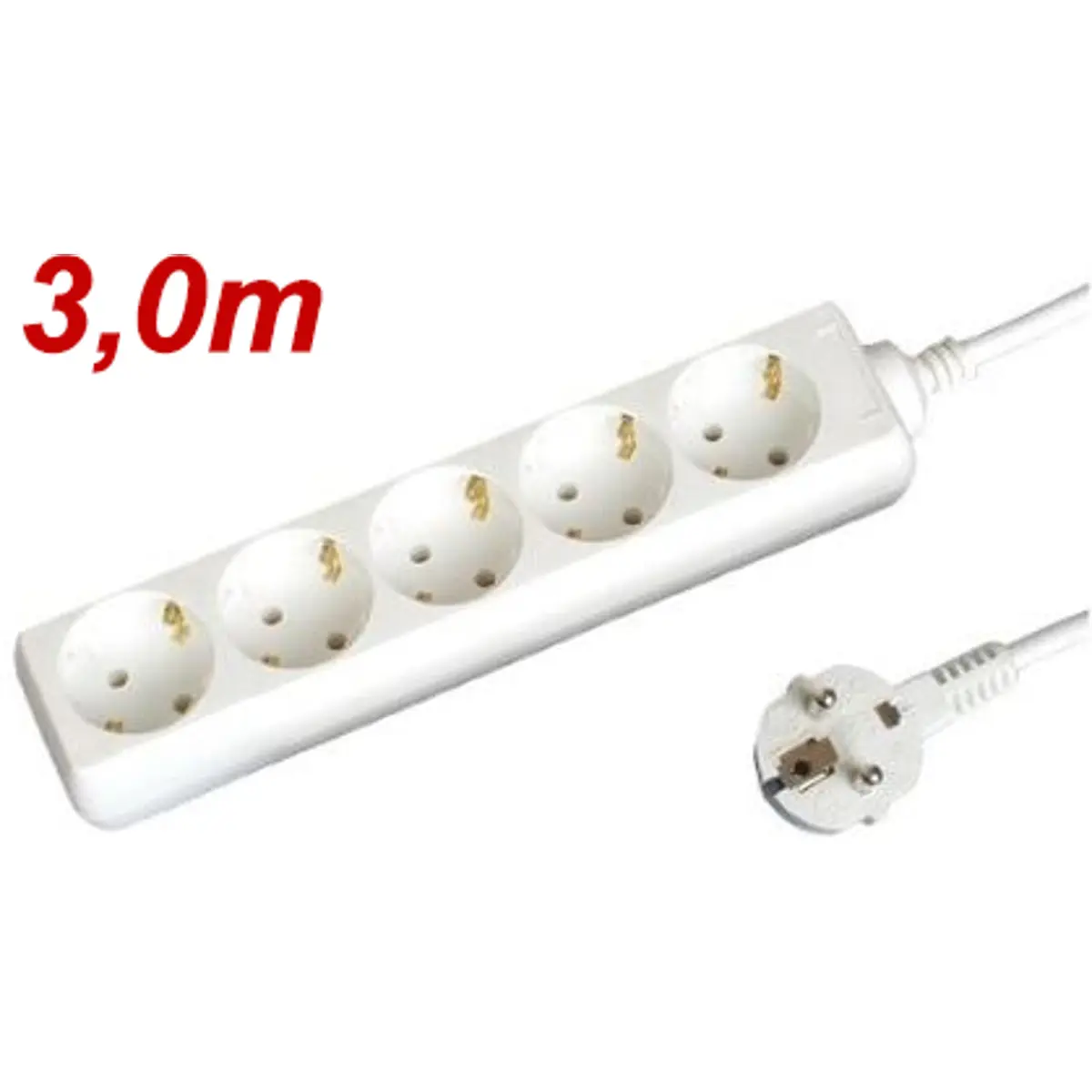 Bloco de tomadas com base múltipla para uso interior, com 5 tomadas Schuko. Cabo de alimentação de 3,0 m em H05VV-F e sem interruptor, suporta até 3500 W. Ideal para escritório ou casa, facilita a gestão de cabos e aumenta a organização de equipamentos. Design branco e compacto, permite montagem discreta em mobiliário ou áreas de trabalho, oferecendo solução prática e segura para ampliar a conectividade eléctrica sem ocupar espaço excessivo.