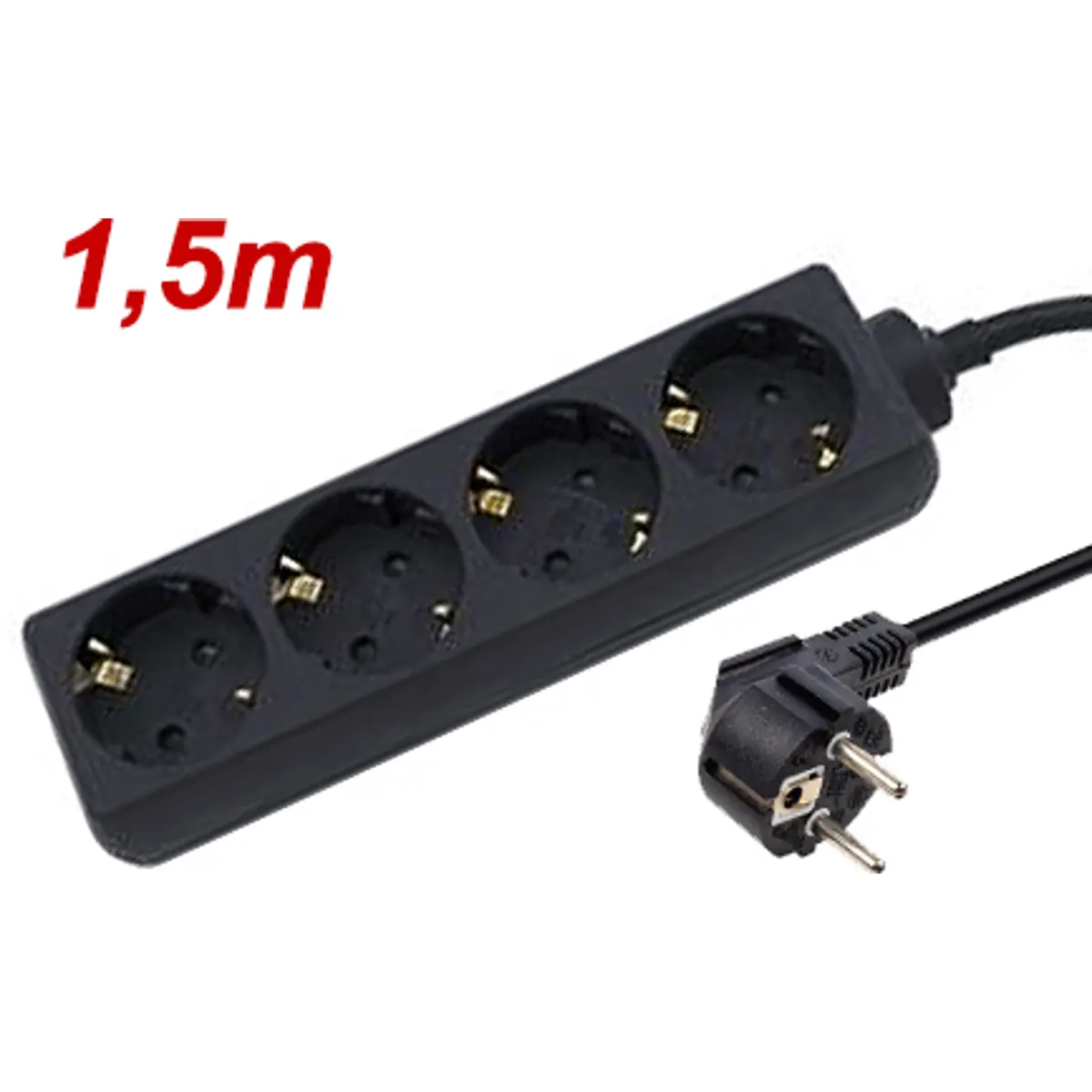 Bloco de tomada com base múltipla de 4 tomadas Schuko, ideal para uso interior. Possui cabo elétrico de 1,5 m com isolamento H05VV-F e secção 3x1,5mm, suportando até 3500 W. Design em preto e sem interruptor, compatível com dispositivos comuns em escritório, quarto ou sala de estar. Facilita a organização de cabos e a distribuição de energia entre vários aparelhos, mantendo a instalação simples e segura em ambientes internos.