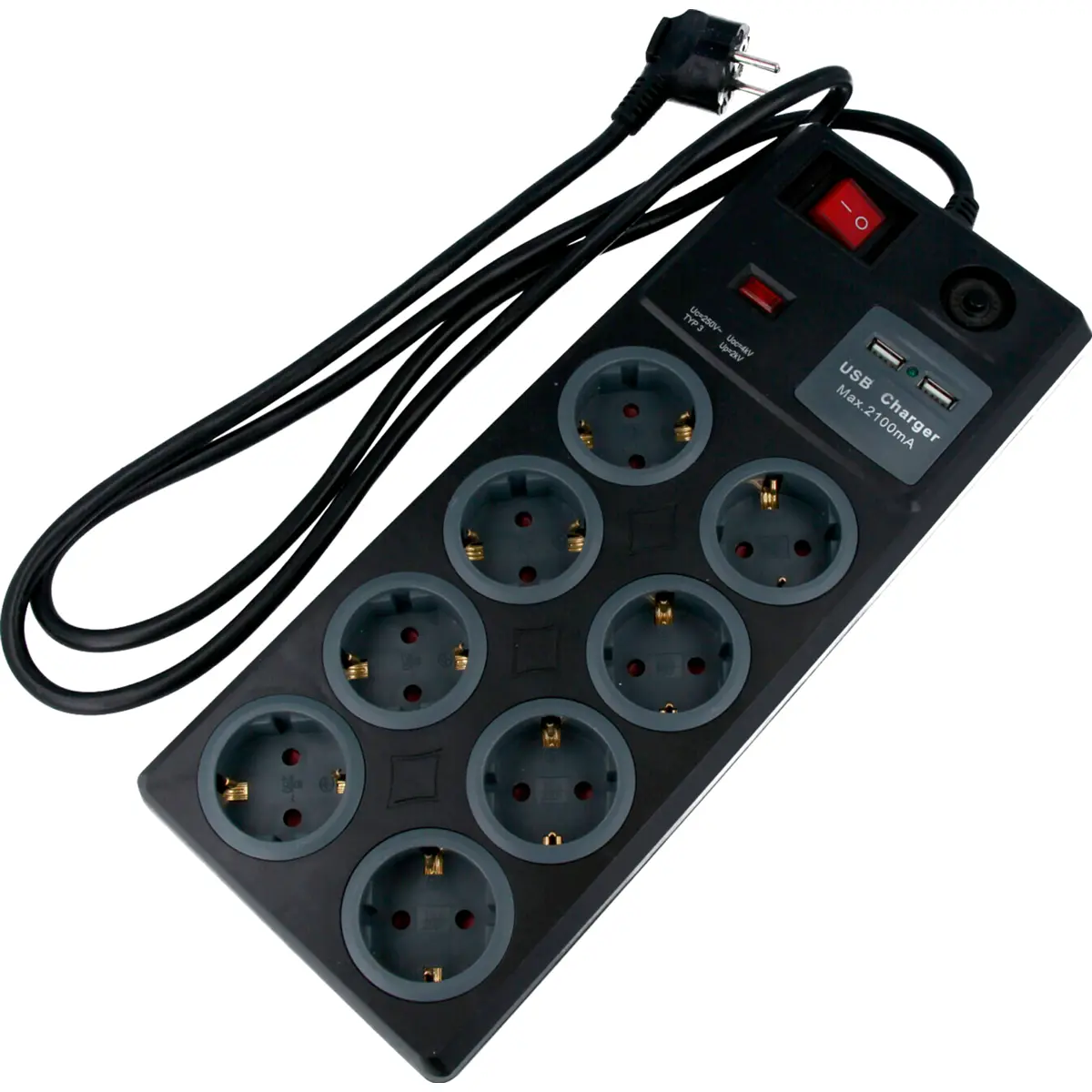 Bloco de tomadas com 8 tomadas, 2 portas USB (2,1 A no total) e interruptor, oferecendo proteção contra sobrecarga e sobretensões. Possui cabo de 1,4 m, condutores 3x1,5 mm² e cabo H05VV-F, na cor preta. Potência máxima de 3680 W para suportar dispositivos de alto consumo, ideal para casa ou escritório.