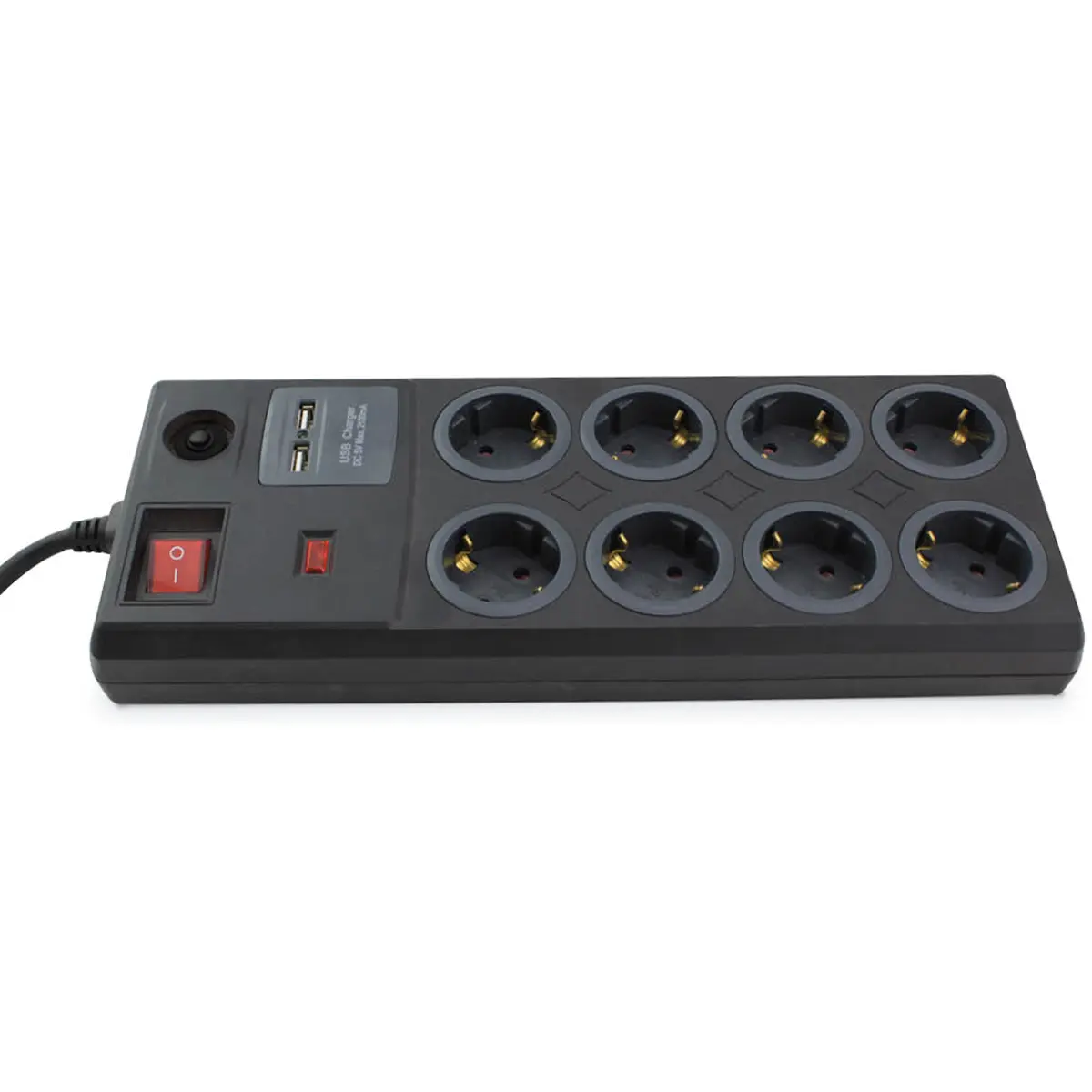 GSC Evolution - Bloco de 8 tomadas c/ 2xUSB + interruptor + proteção contra sobrecarga - Preto - cabo (3x1.5mm²) 1.4m