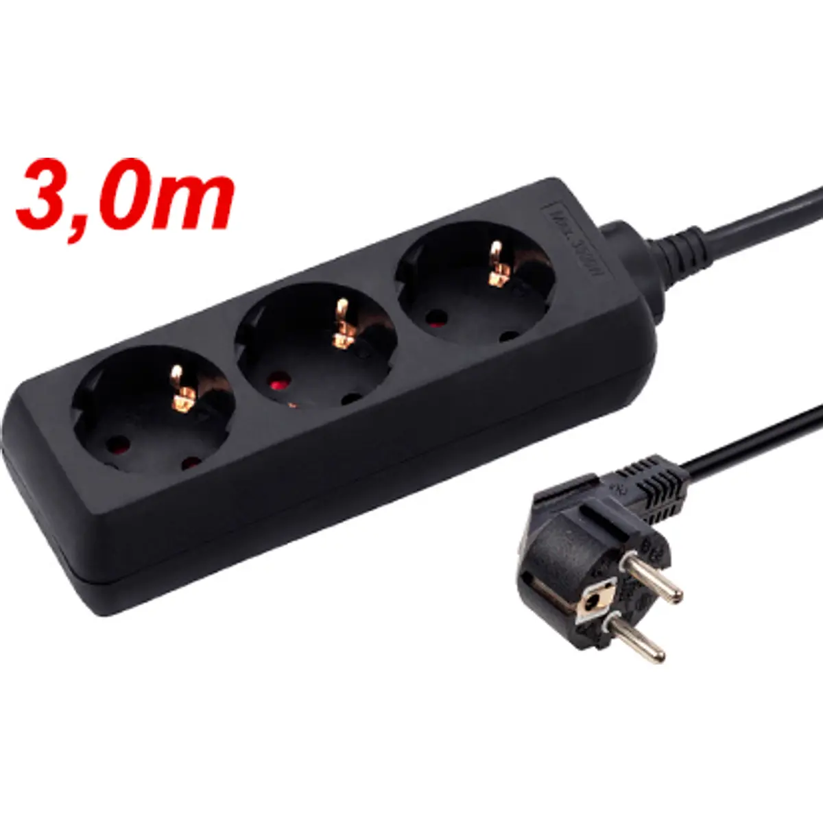 Bloco de tomadas preto para uso interior com base múltipla de 3x Schuko e cabo H05VV-F 3G1.5. Sem interruptor, comprimento de 3.0m e potência máxima de 3680W. Ideal para ligar vários dispositivos, mantendo o espaço organizado e assegurando uma alimentação estável.