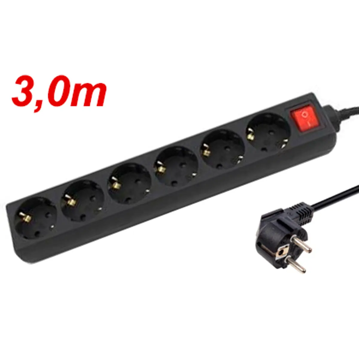 Bloco de tomadas com base múltipla de seis tomadas Schuko e interruptor, ideal para uso interior. O conjunto inclui cabo elétrico H05VV-F 3x1.5mm, com 3,0 m de comprimento e potência máxima de 3680 W, permitindo ligar vários dispositivos a partir de uma única tomada. Prático para escritório, casa ou área de trabalho, facilita a organização de cabos e oferece segurança em ambientes internos.