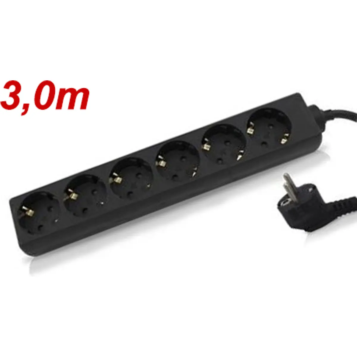 Bloco de tomadas com seis entradas para uso interior, apresentado com cabo H05VV-F 3G1.5 e acabamento preto. Inclui conector Schuko Type F (CEE 7/7), proteção IP20 e interruptor integrado, permitindo ligar e desligar rapidamente os dispositivos. Suporta até 3680 W de potência e 16 A de corrente, oferecendo alimentação estável para múltiplos equipamentos sem sobrecarregar tomadas. O conjunto mede aproximadamente 255 mm de largura e 3 metros de cabo, com ângulo de 45° no conector fêmea, facilitando a posição e a organização.