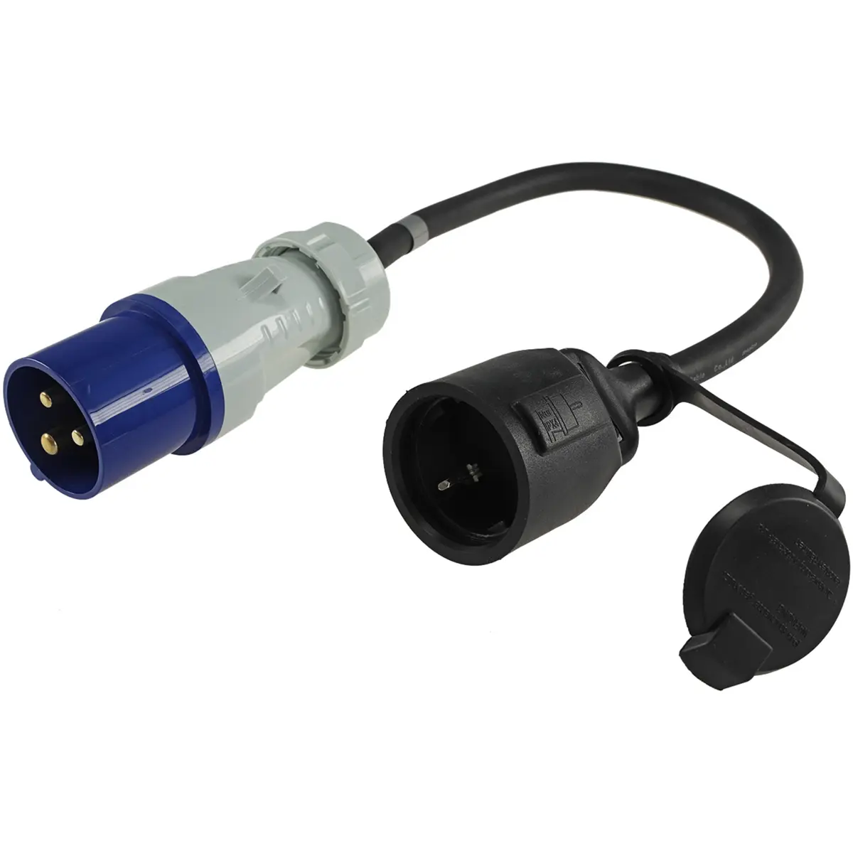 Este cabo adaptador Schuko fêmea com ficha CEE 16A monofásica macho de 3 pólos, com 0,35 m de comprimento, é ideal para campismo, caravanismo e caravanas. Utiliza cabo H07RN-F 3G2.5 e suporta 230 V a 16 A. Com proteção IP44, é resistente a respingos, adequado para uso externo. Perfeito para ligações rápidas entre tomadas de camping e equipamentos elétricos, oferecendo fiabilidade, segurança e versatilidade em ambientes exteriores.