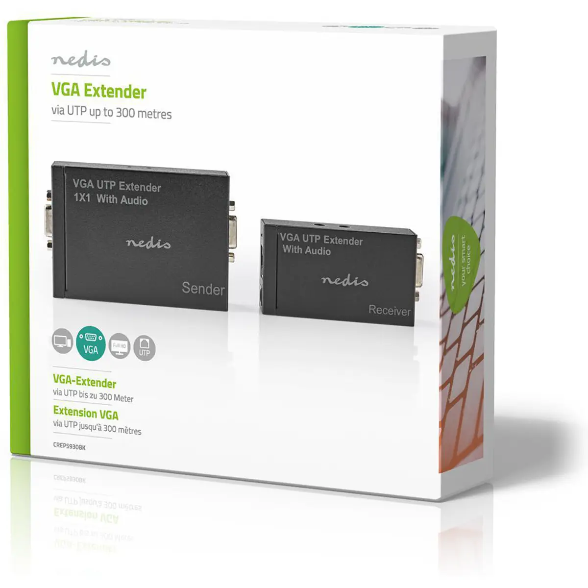 Os dados visuais e de áudio são transportados sem perda de sinal do transmissor (localizado próximo ao PC) para o receptor (localizado próximo ao monitor) em distâncias de até 300 metros.