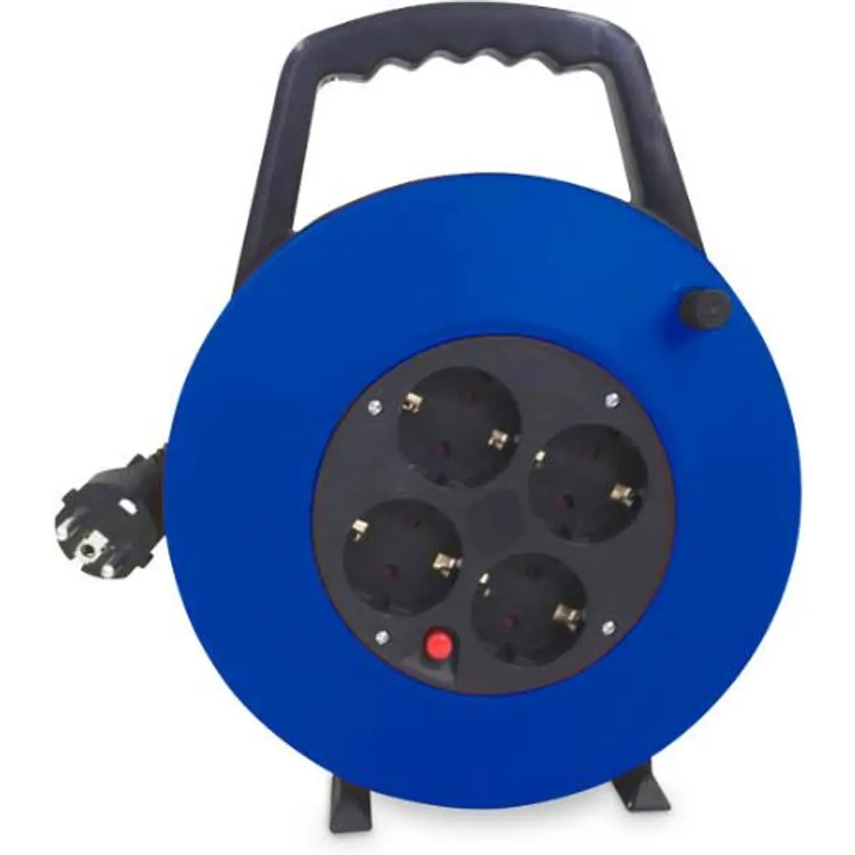 Enrolador de cabo com 10 m de extensão, equipado com 4 tomadas Schuko Type F e disjuntor rearmável. Fabricado com cabo H05VV-F 3G1.5 e corpo em plástico, disponível em preto/azul. Adequado para uso interior em escritório, bancada ou casa, suporta até 3120 W e 16 A, oferecendo proteção IP20. Permite organizar cabos com facilidade e garantiza energia segura para equipamentos elétricos, mantendo a área de trabalho limpa e protegida.