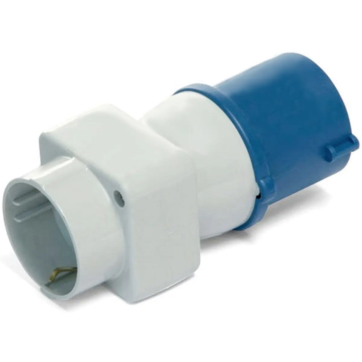 Este adaptador Schuko fêmea com ficha CEE 16A monofásica oferece ligação elétrica até 250V e 16A, com proteção IP44. Destina-se a ligar dispositivos a tomadas compatíveis, possuindo 3 pólos para uma conexão estável. Sem referência de marca, descreve-se como solução prática para condução de energia em sistemas elétricos que exigem conectividade segura entre componentes.