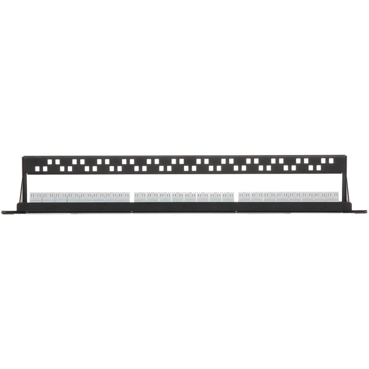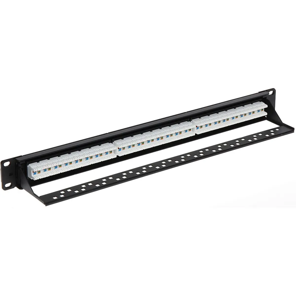Painel de distribuição com 24 conectores Keystone RJ-45 para cabos Cat6, ideal para racks 19'' 1U. Construção em metal preto, oferece montagem rápida sem ferramentas graças aos terminais de pressão, e inclui furos na placa para abraçadeiras. Compatível com cabos de par trançado de categoria 6, com peso de 0,4 kg e dimensões de 483 x 75 x 44 mm, promovendo organização eficiente de cabos e conectividade estável em armários de rede.