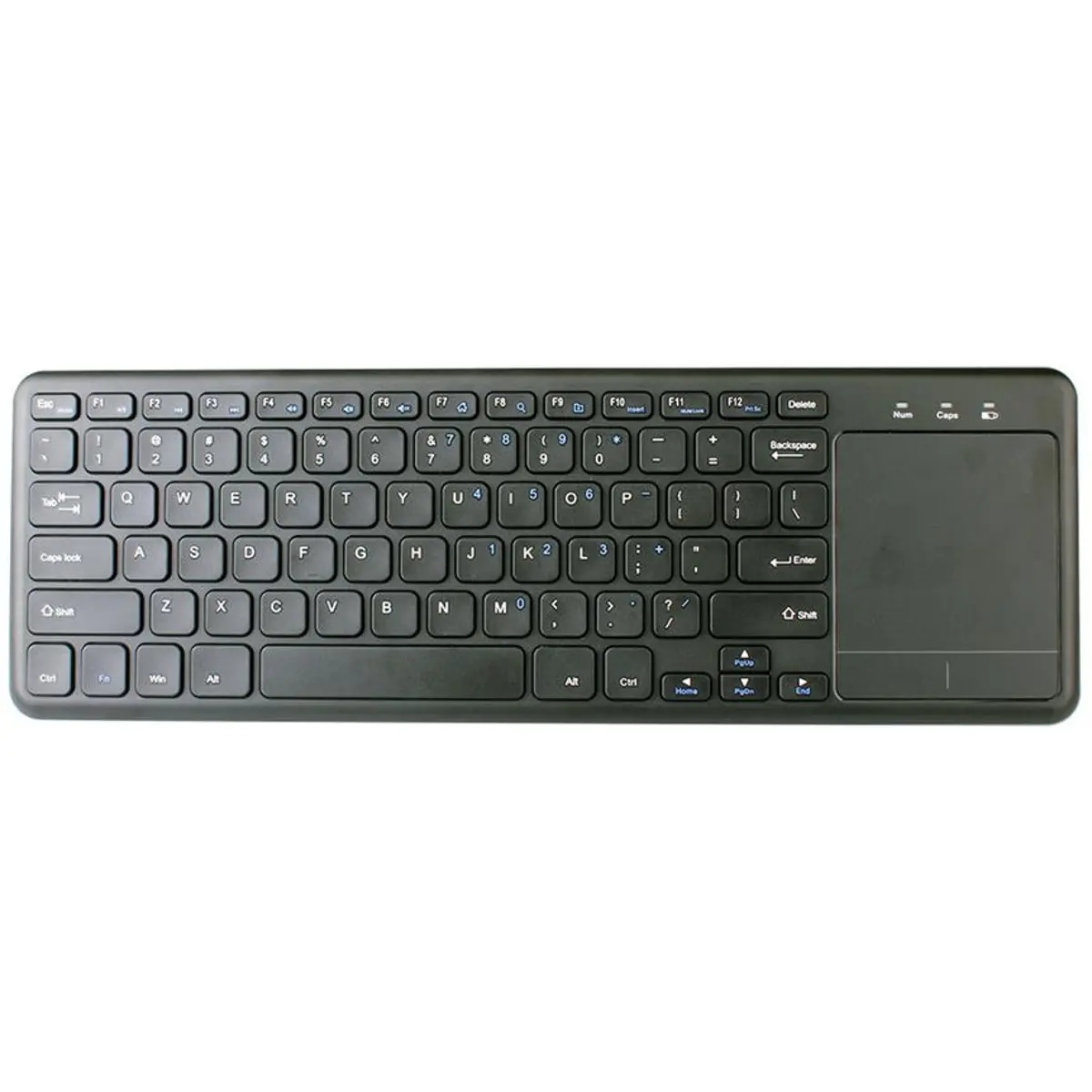 Teclado Slim Bluetooth com touchpad, compatível com Windows, MAC OS, Linux e Smart TV, com 78 teclas, 13 atalhos e mecanismo de teclas scissor. Possui touchpad grande de 74 x 90 mm, revestimento UV para maior durabilidade e interface Bluetooth, com receptor não incluído. Design de baixo perfil adequado a uso no media center, oferecendo digitação confortável, controlo do cursor sem fios e instalação simples.