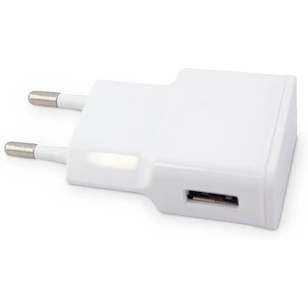 Carregador compacto com conector euro tipo C e uma saída USB-A fêmea, para alimentação a 240V AC (50-60 Hz). Permite carregar dispositivos USB-A, oferecendo uma solução simples para uso doméstico ou profissional.