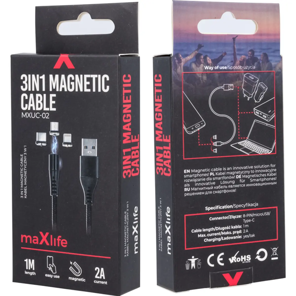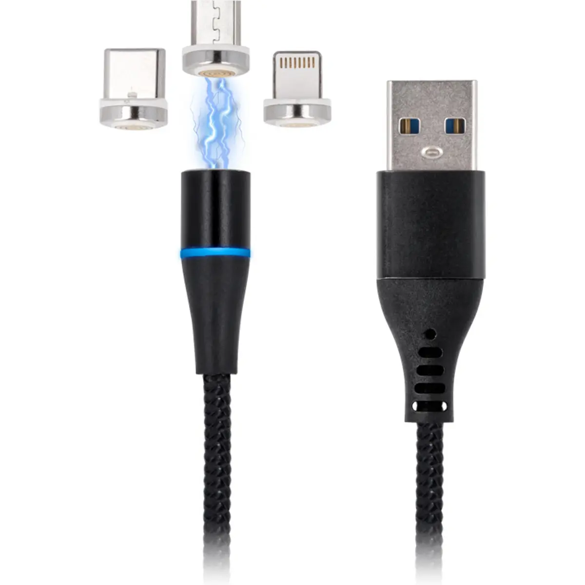 Maxlife MXUC-02 - Cabo USB magnético 3-em-1 Lightning + USB-C + micro-USB - 2A Fast Charge