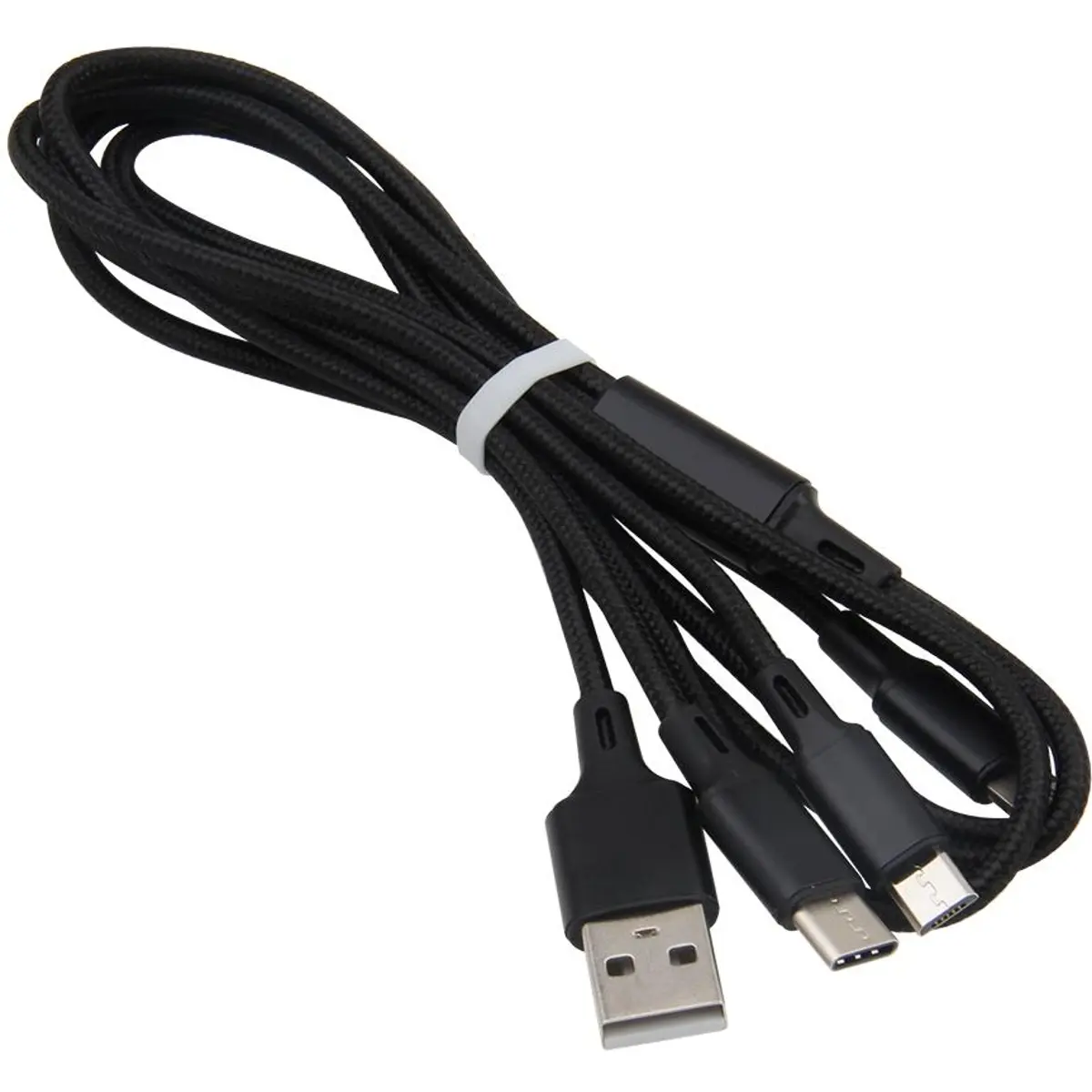 Este cabo USB 2.0 3-em-1 oferece conectores Lightning, USB-C e micro-USB num único acessório, ideal para viagens. Pode carregar iPhone, tablets e leitores de e-book sem necessidade de vários cabos. Com 100 cm de comprimento, é feito em TPE e nylon, com conectores em alumínio, na cor preta, oferecendo durabilidade e conveniência. Perfeito para quem procura uma solução versátil de carregamento e organização de cabos no dia a dia.
