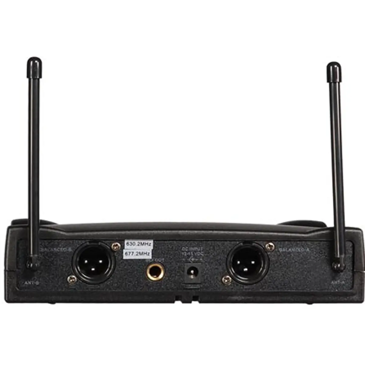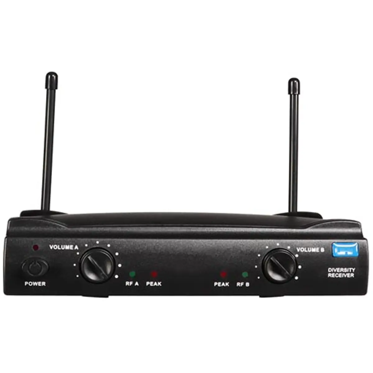 Este sistema sem fios UHF apresenta dois microfones de mão e um receptor de canal duplo, ideal para apresentações, conferências e eventos. Utiliza PLL para receção estável e opera nas frequências 863.050 MHz e 854.00 MHz, com resposta de 40 Hz a 18 kHz. Oferece elevada relação sinal/ruído de 100 dB e amplitude dinâmica superior a 100 dB, com alimentação de 12 VDC até 500 mA. Inclui pilhas AA nos microfones para mobilidade e pode ser usado em palco ou bancada.