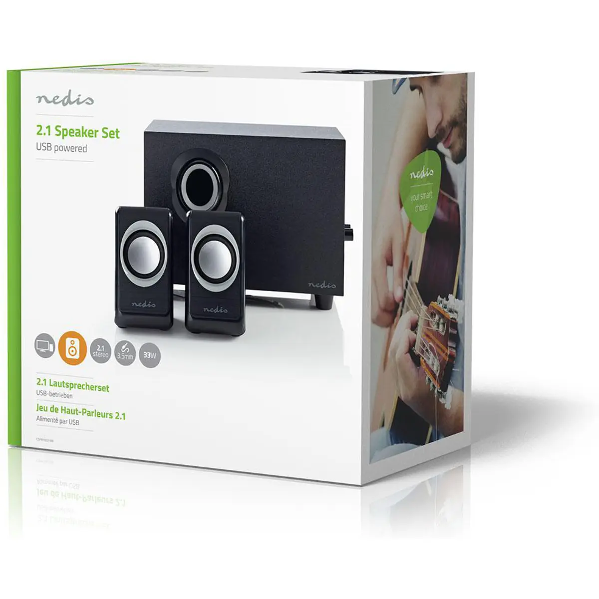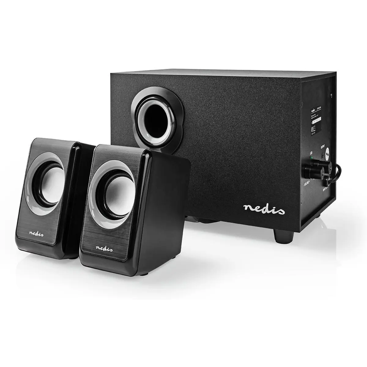 Troque o fraco som metálico do seu PC ou smartphone por áudio de qualidade em estéreo 2.1 com este conjunto de alto-falantes com alimentação USB de 33W da Nedis.