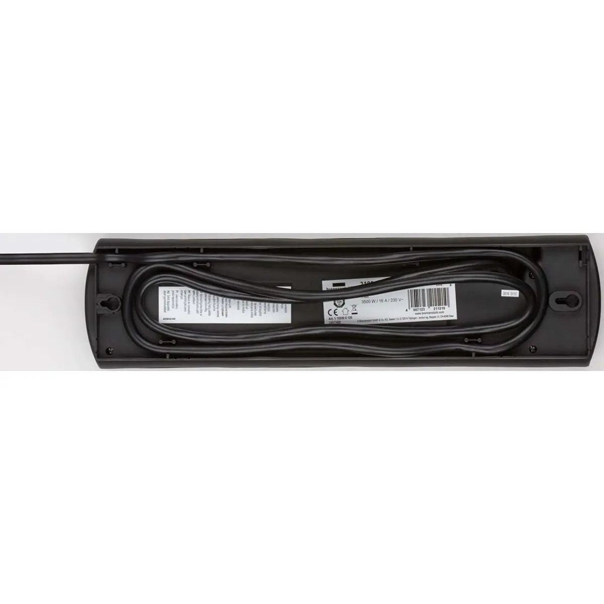 Pode ser pendurada e o excesso de cabo pode ser arrumado e fixado na parte posterior.