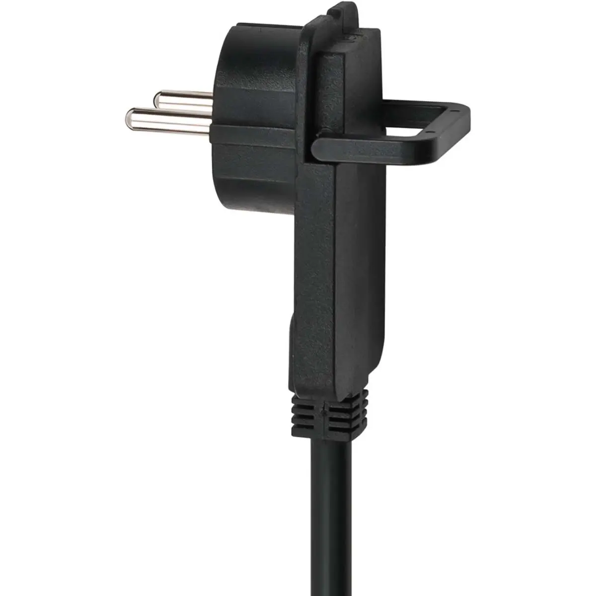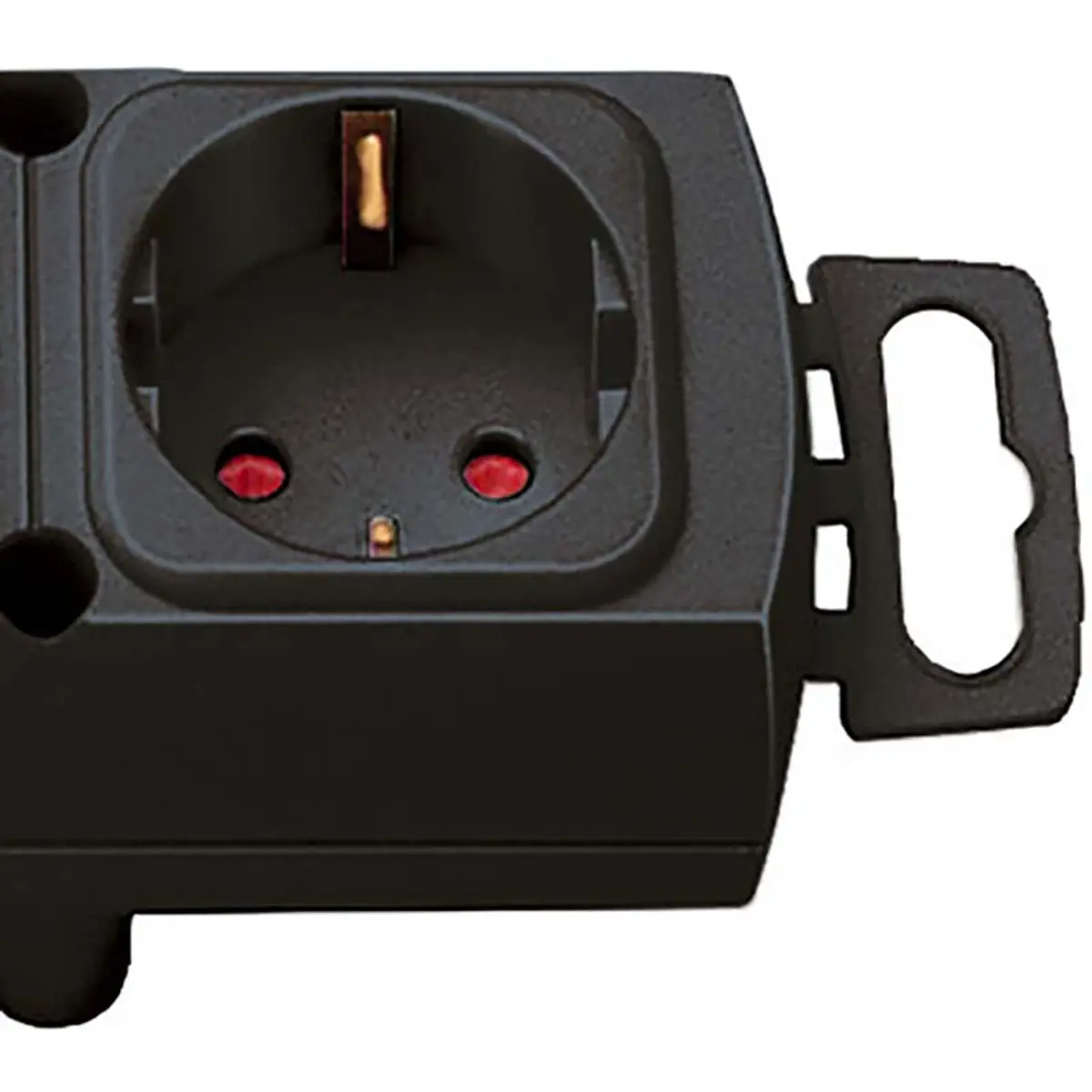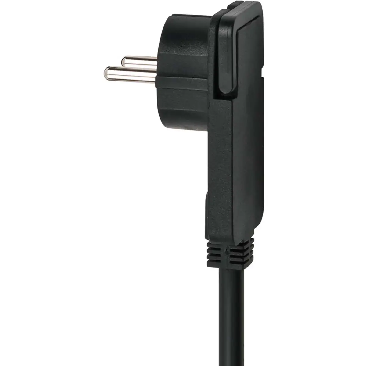 Bloco de tomadas com quatro tomadas separadas em ângulo de 90°, ideal para ligar vários carregadores grandes sem encostar uns aos outros. Ficha espalmada com pega retrátil facilita a instalação atrás de mobiliário. Possui alvéolos protegidos para crianças e interruptor de dois polos iluminado; não possui fusível. Alimentação de 230 V AC e 16 A, cabo de alimentação de 2 m (H05VV-F 3G1.5) com ficha Tipo F (CEE 7/7) a 90°. Cor preta, comprimento do bloco ~32 cm.
