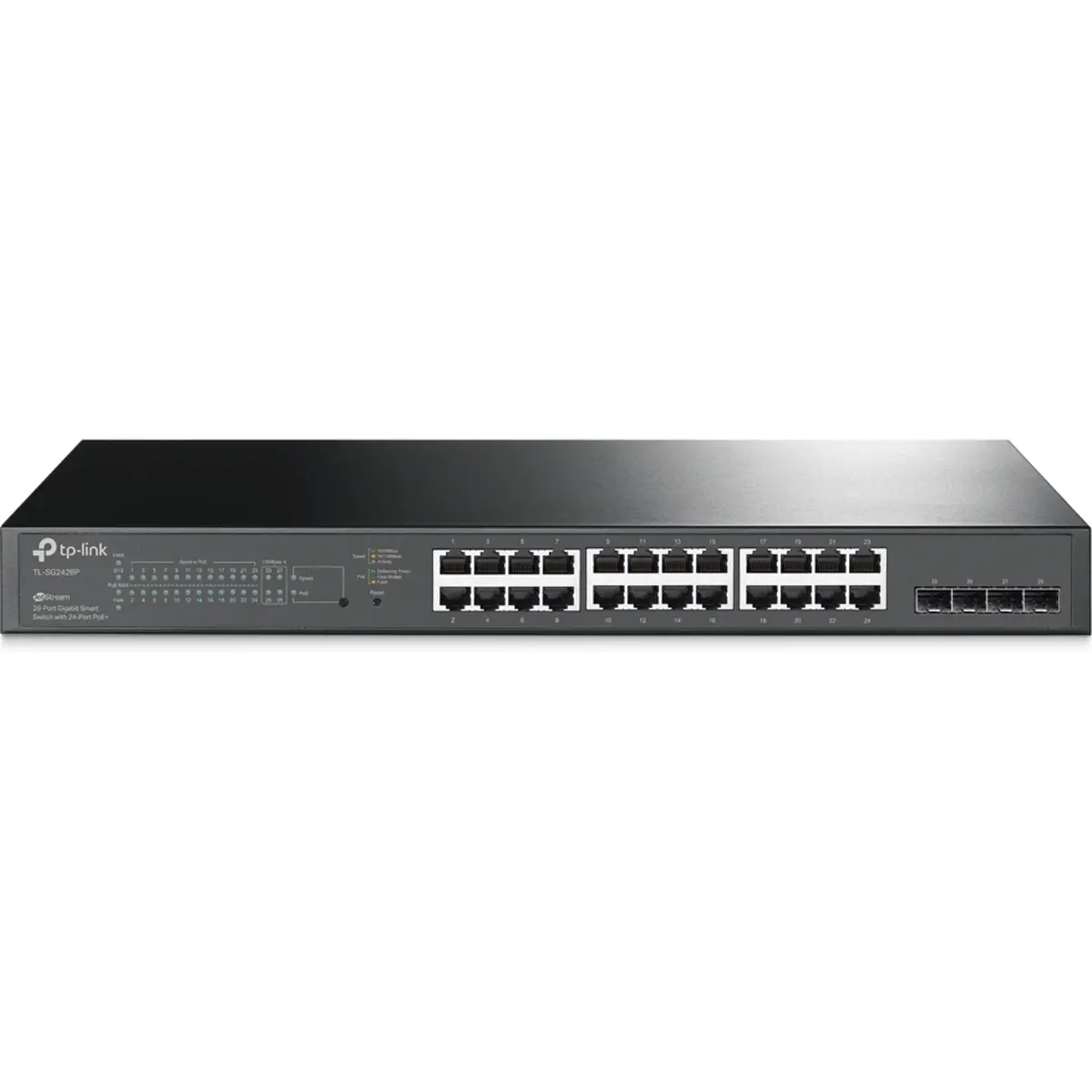 Switch TP-Link TL-SG2428P, com 24 portas Gigabit PoE+ e 4 portas Gigabit SFP Slots. Tem uma potência máxima combinada de 250W. Gerenciamento centralizado, Roteamento estático, Estratégias de segurança robustas e Possibilidade de optimizar os aplicativos de voz e vídeo.