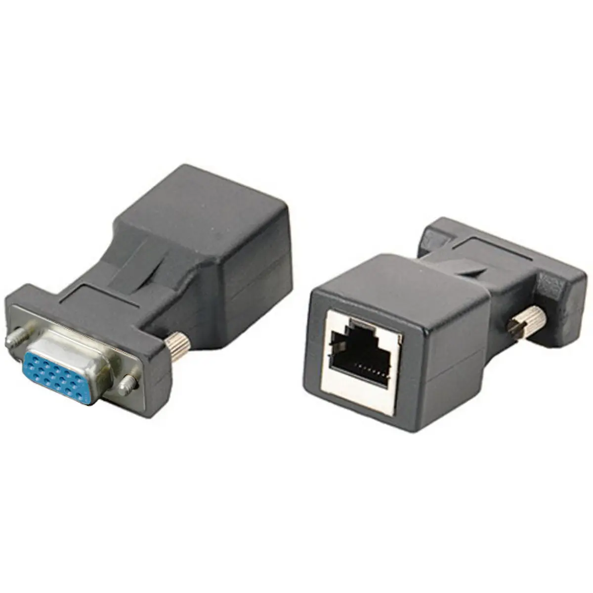 Este adaptador DB15 fêmea para RJ45 fêmea pode ser usado para comunicação de dados entre dispositivos de interface VGA com um cabo de rede RJ45 ou como um extensor do sinal VGA até cerca de 20 m.
