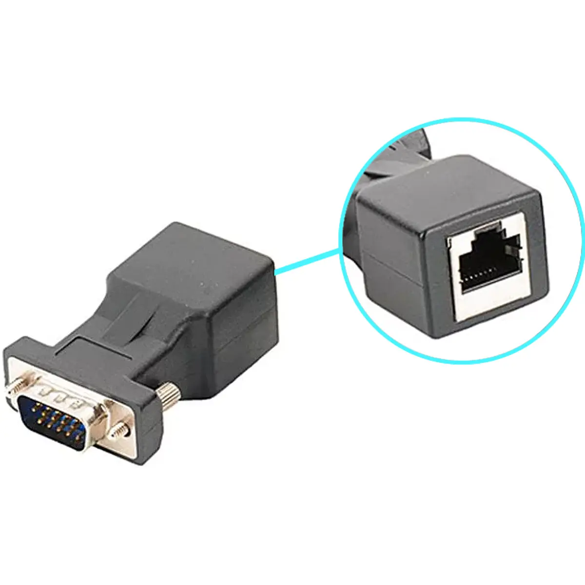 Este adaptador DB15 macho para RJ45 fêmea pode ser usado para comunicação de dados entre dispositivos de interface VGA com um cabo de rede RJ45 ou como um extensor do sinal VGA até cerca de 20 m.