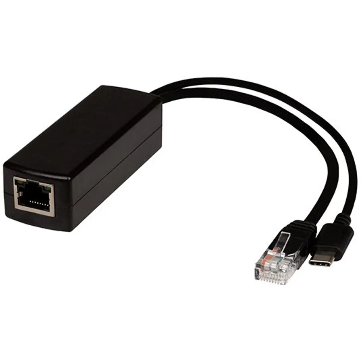 Este Spliter permite fornecer energia ao seu Raspberry Pi 4B (ou outros equipamentos com uma conexão USB-C) através de um cabo de rede LAN.