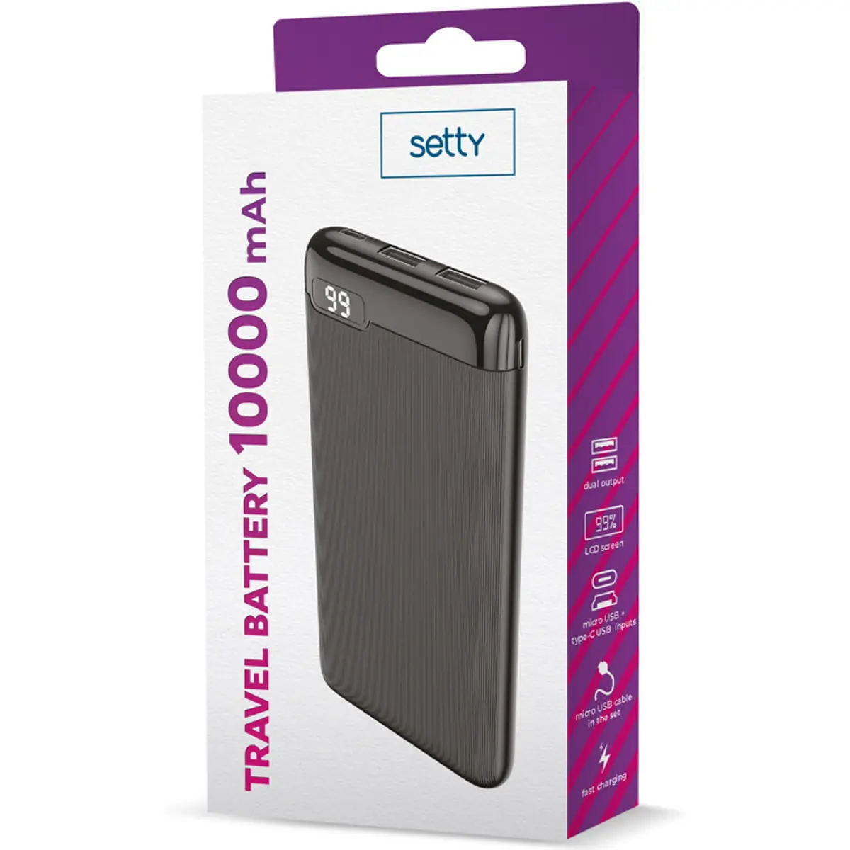 Setty Power Bank 10000 mAh tem duas saídas USB e duas entradas – micro-USB e USB-C. Este possui uma capacidade que pode carregar a maioria dos smartphones pelo menos duas vezes. O display LCD mostra o nível de energia que resta do seu powerbank.