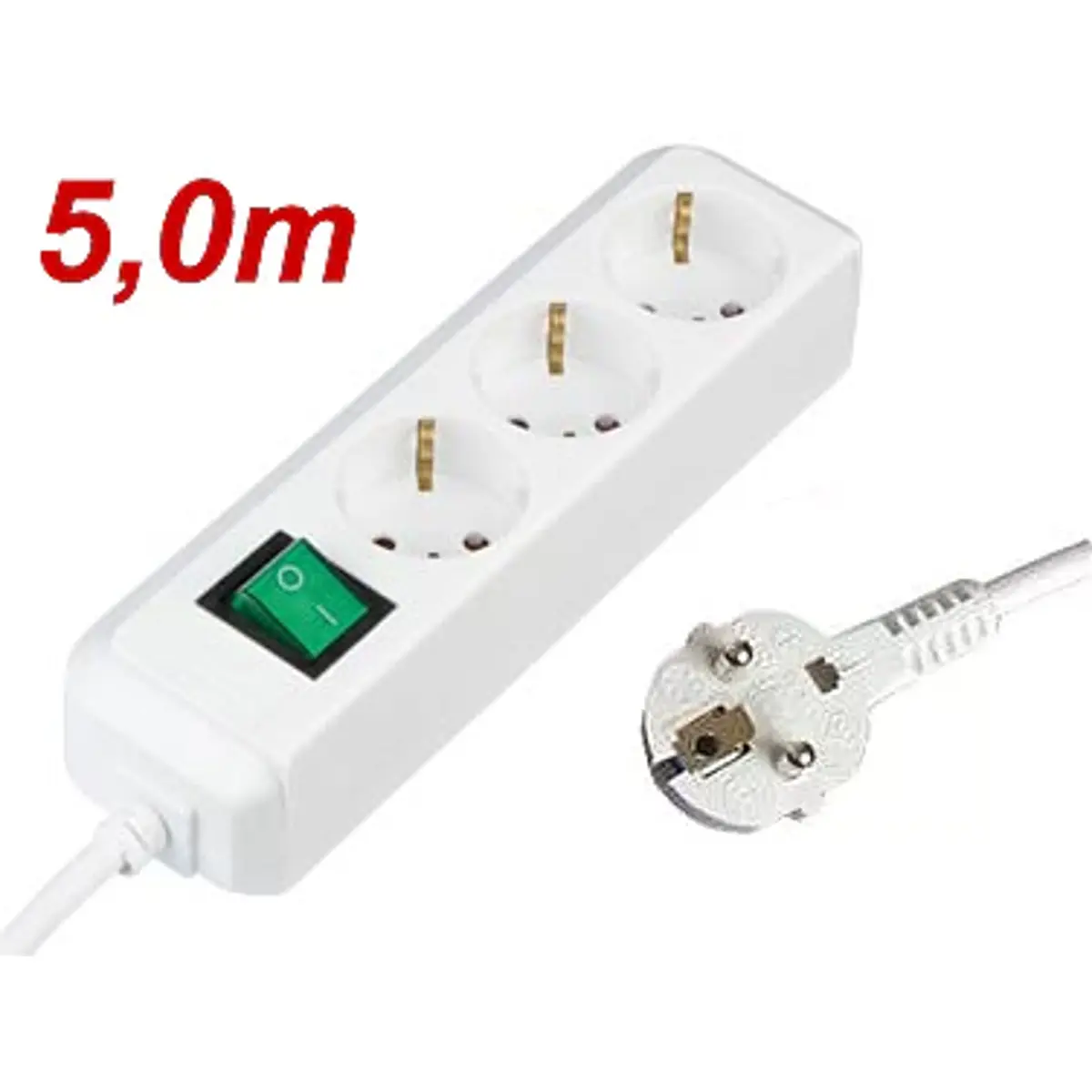 Bloco de tomadas com 3 tomadas Schuko e interruptor, ideal para uso interior. Cabo elétrico de 5 metros com seção 3x1.5 mm² em H05VV-F, proporcionando alimentação estável e flexibilidade de posicionamento. Construção em branco, com base múltipla para maior alcance. Compatível com cargas até 3500W, adequado para dispositivos domésticos e computadores. Este equipamento oferece comodidade, organização de cabos e fácil comutação, sem necessidade de várias extensões.