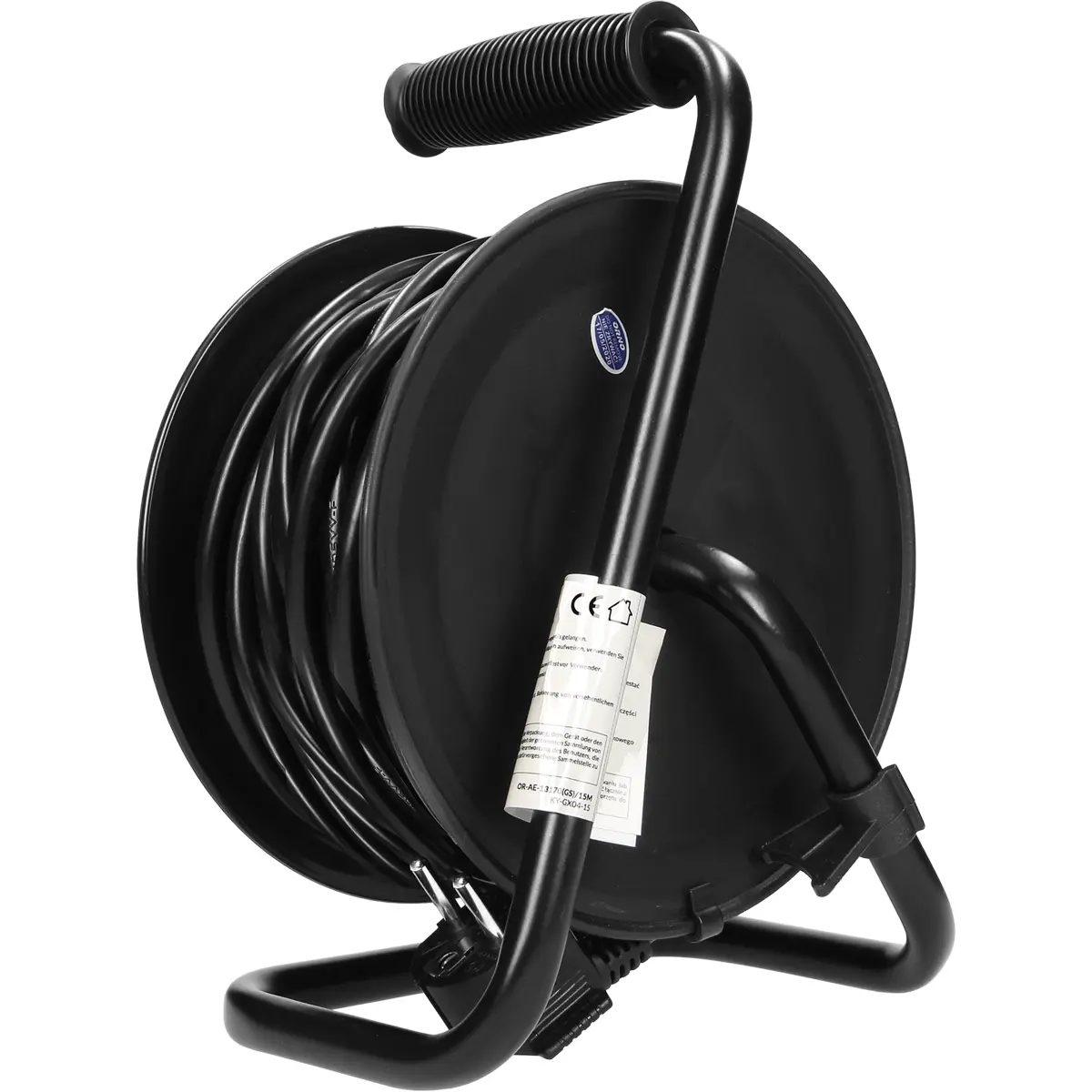Cabo de extensão numa bobina retráctil com suporte metálico e protecção contra sobrecarga sob a forma de interruptor térmico. Tem quatro tomadas de ligação à terra, uma pega de transporte conveniente e um clip para fixar a ficha. Equipado com uma manivela para retracção do cabo e uma tranca para desenrolamento acidental.