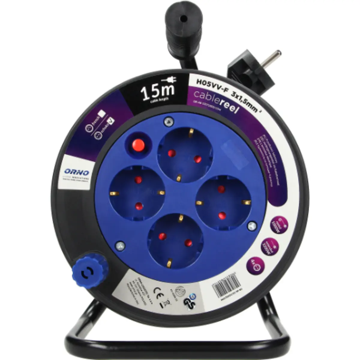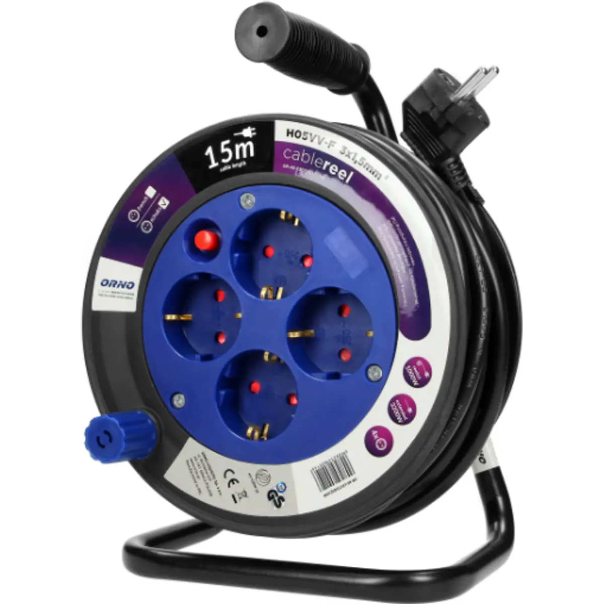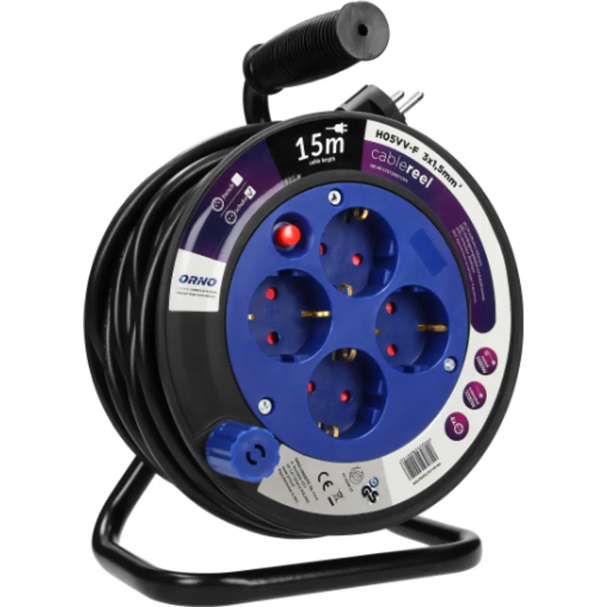 Orno OR-AE-1339/G(GS - Enrolador Schuko c/ pega de 15m (3G 1.5mm²) c/ 4 tomadas + disjuntor