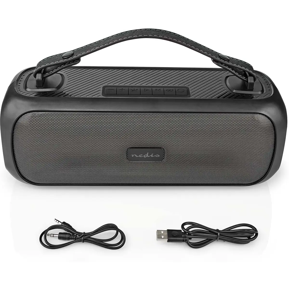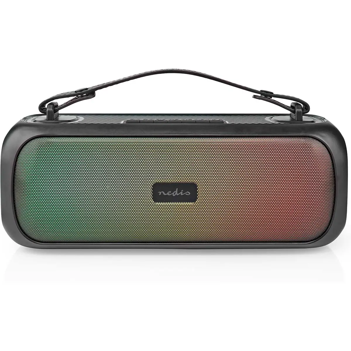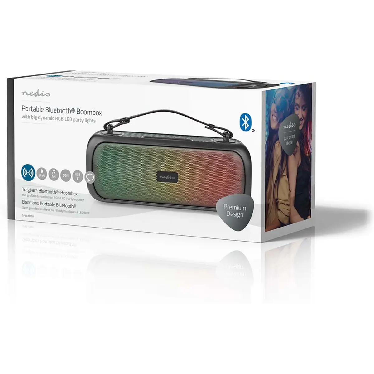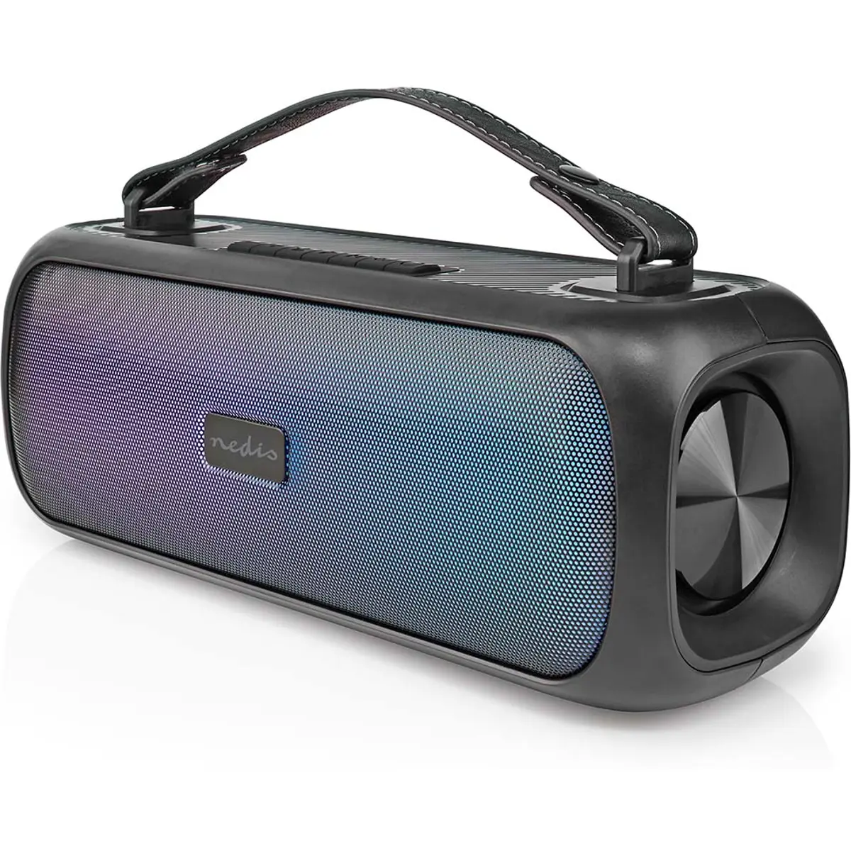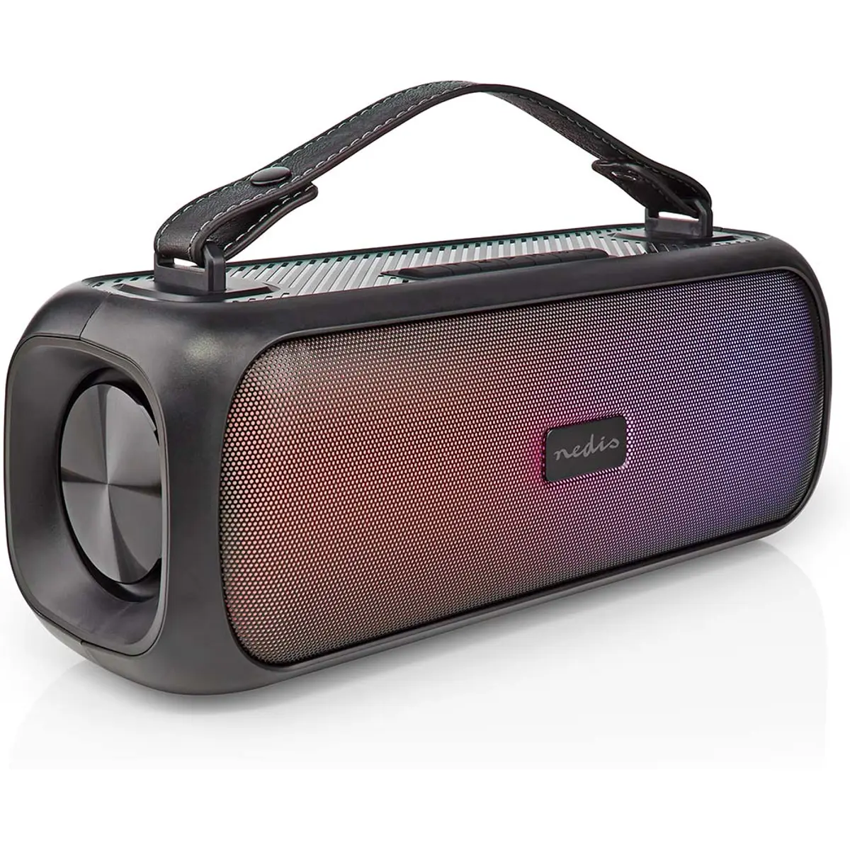 Este reprodutor de áudio portátil para festas é uma coluna sem fio de 2.0 canais de 30 W que oferece um som potente e puro com graves potentes. Pode animar a festa com as grandes luzes LED RGB dinâmicas na frente. Estas luzes RGB mudam de cor enquanto a música está a tocar, mas também podem ser desligadas.