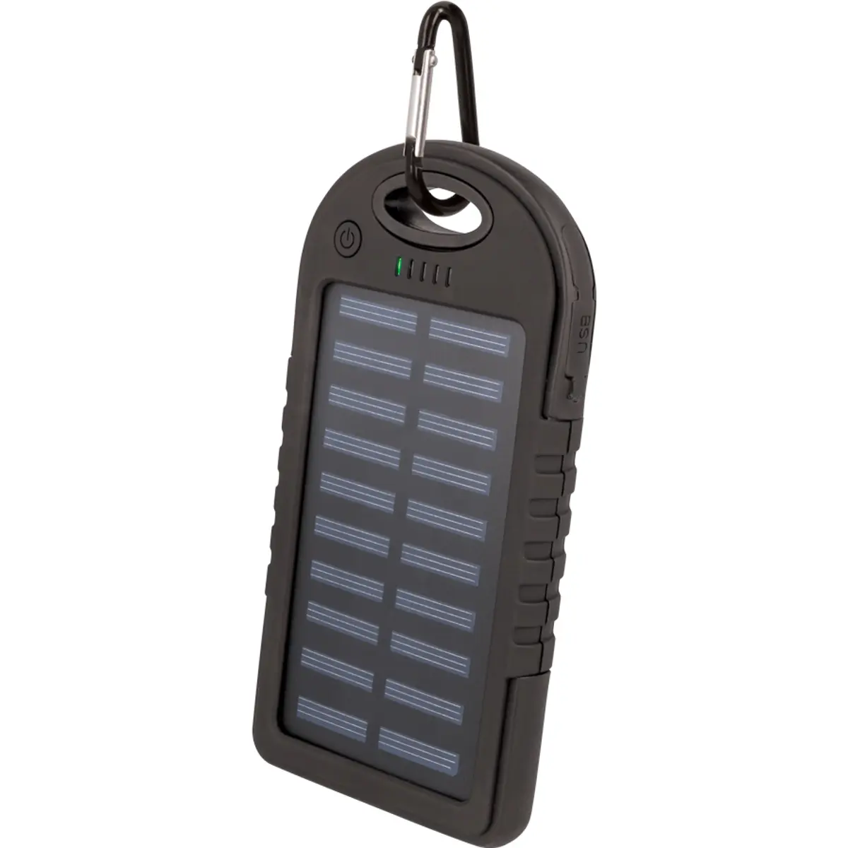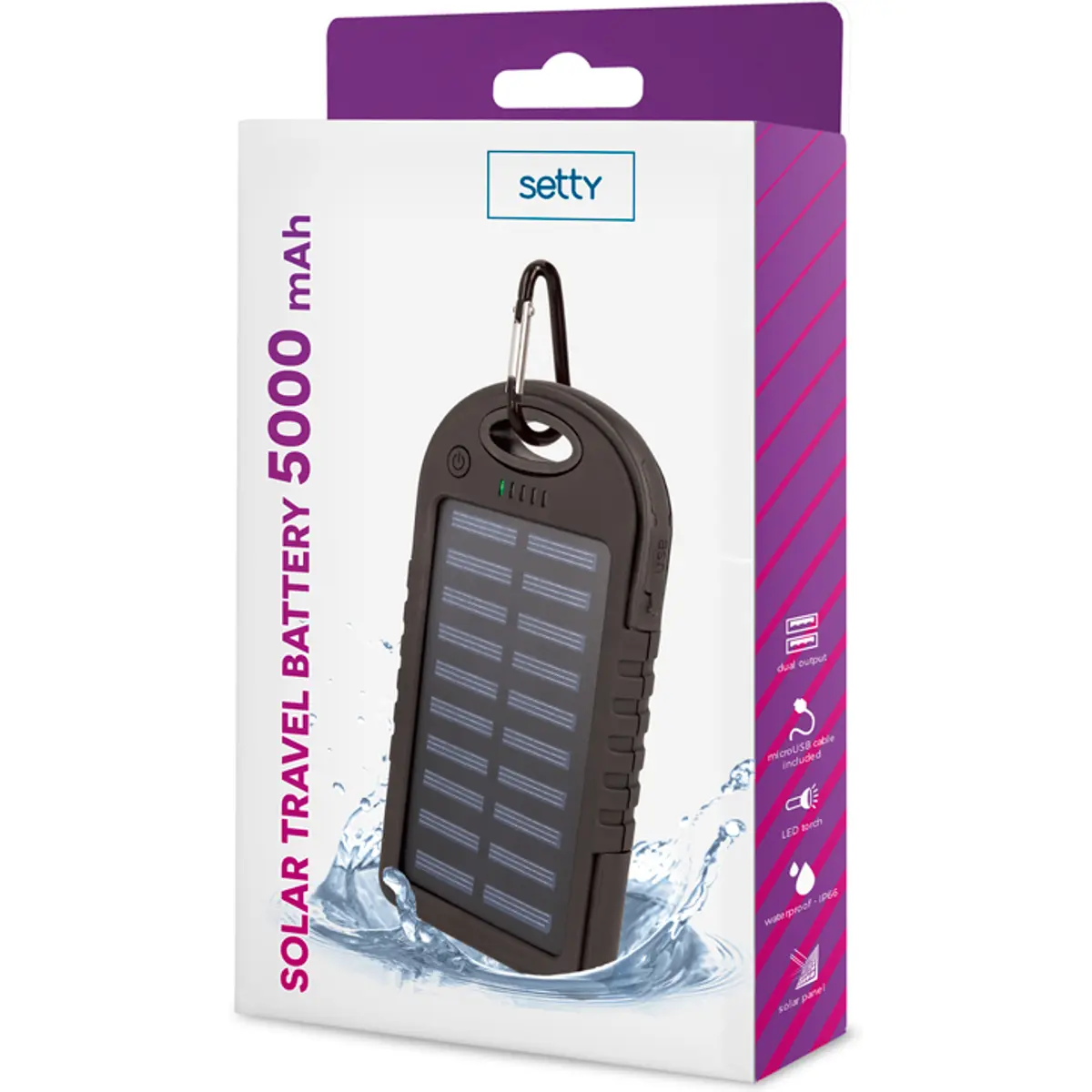 Powerbank solar Setty com capacidade de 5000 mAh. Recarregue seu aparelho com energia solar, não precisa mais de eletricidade! Também não precisa se preocupar com o fato de que seu banco de energia ficará sem bateria. O dispositivo possui uma porta de entrada micro USB. O conjunto inclui um cabo micro USB e um mosquetão.