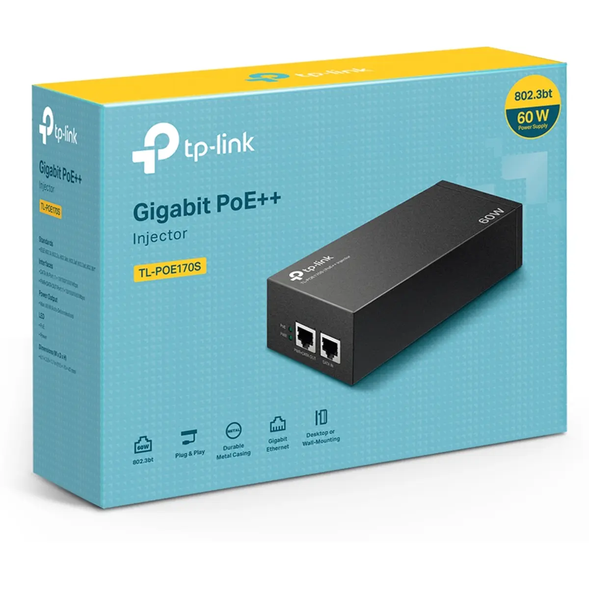 O Injetor PoE++ TL-POE170S está totalmente em conformidade com as normas IEEE 802.3af/at/bt* com uma alimentação até 60 W. Pode expandir facilmente a sua rede para onde não existe uma linha de alimentação ou saída, onde deseja corrigir dispositivos como câmaras IP PTZ, LED, etc.