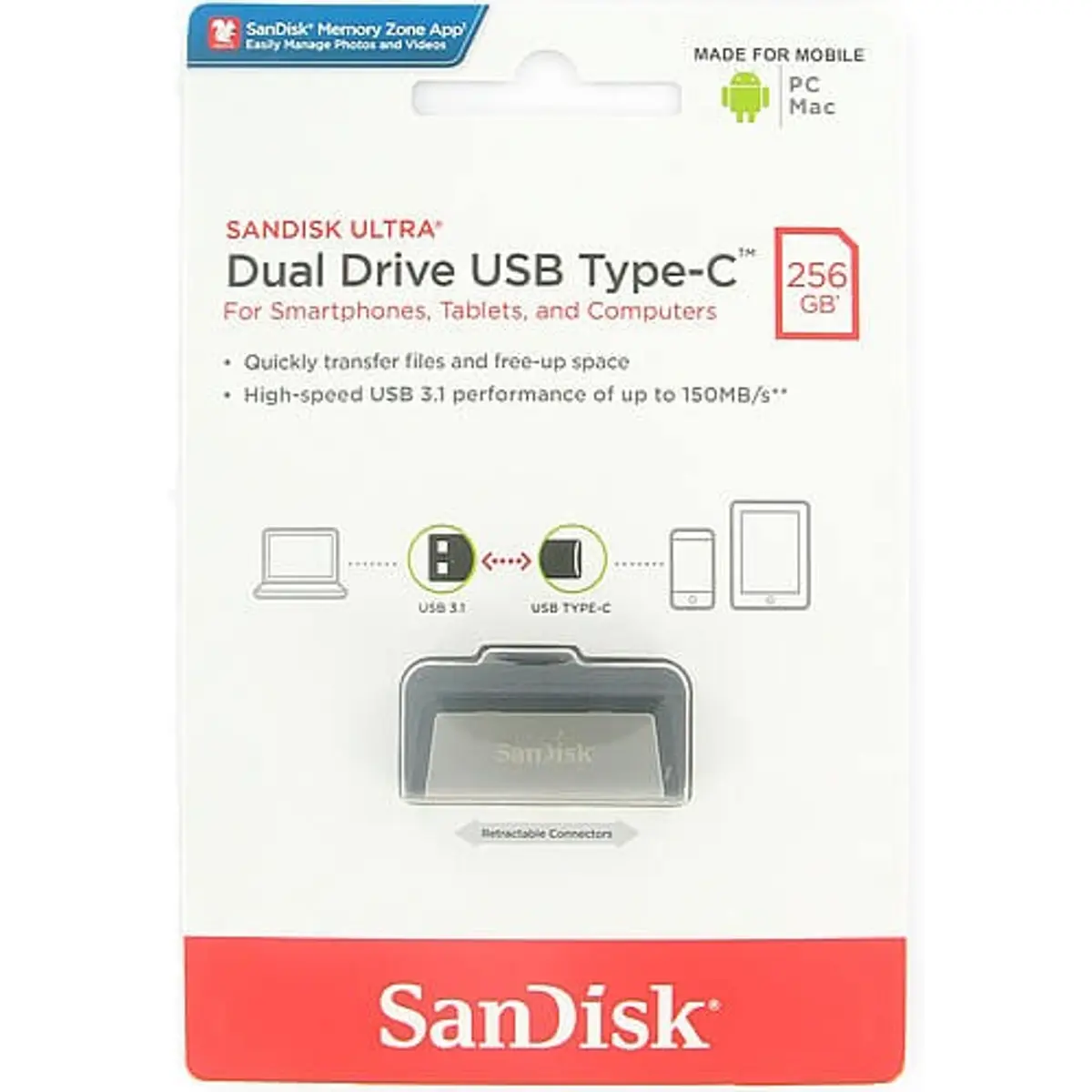 Com um conector USB-C numa extremidade e um conector USB tipo A na outra, esta pendrive (SanDisk Ultra® Dual Drive USB Type-C™) facilita a transferência de ficheiros do smartphone ou tablet (Android) para o computador (e vice-versa) a uma velocidade que pode chegar aos 150MB/s.