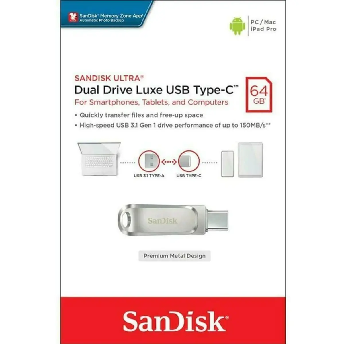Está à procura de uma pendrive que funcione com os seus dispositivos USB Type-C™ e Type-A? O SanDisk Ultra® Dual Drive Luxe, totalmente metálico, permite-lhe mover, com facilidade, arquivos entre dispositivos com USB Type-C (como smartphones, tablets, Macs, etc.) e computadores com USB Type-A.