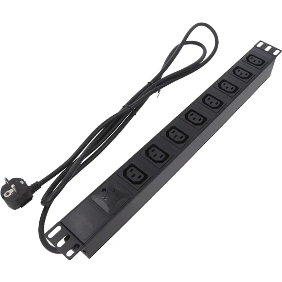 Bloco de alimentação para rack de padrão 19'' com 7 tomadas IEC C13, 230V AC, 10A de corrente, proteção contra sobre-tensão e cabo de 2 metros. Ideal para gabinetes e salas de servidores, facilita a organização de cabos, assegura ligação estável em barramentos de 19'', e oferece fixação segura em armários com suportes de montagem. Perfeito para infraestruturas de TI, centros de dados e ambientes de rede que exigem confiabilidade e gestão eficiente de energia.